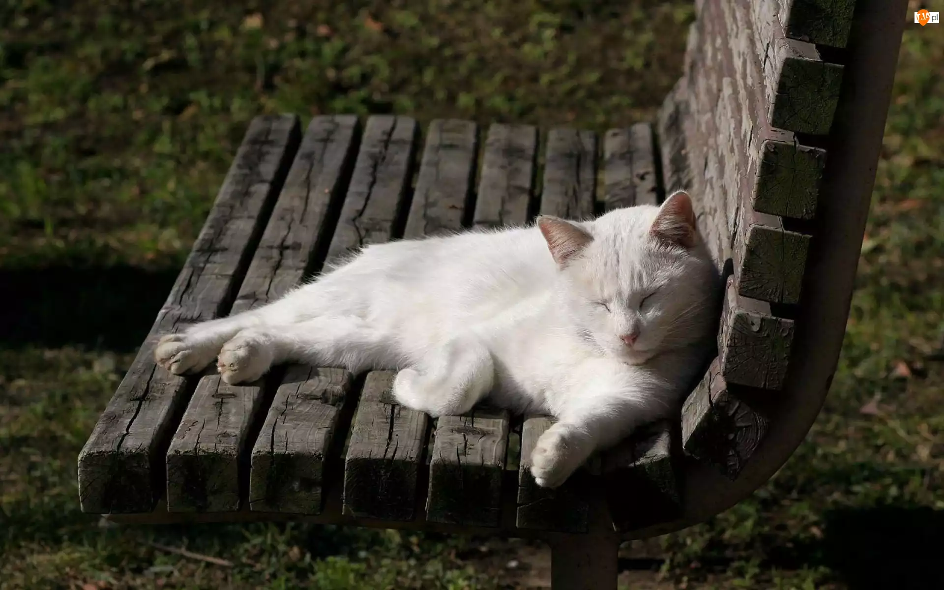 Śpiący, Kot, Ławka, Trawa, Biały