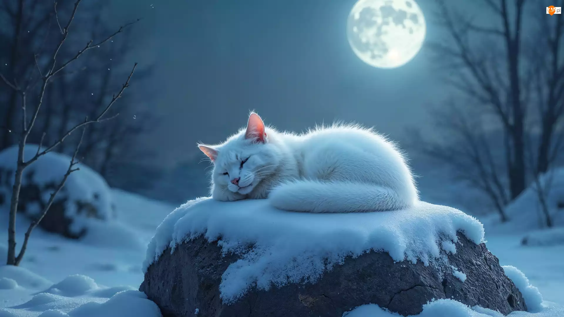 Kamień, Księżyc, Kot, Zima, Śnieg