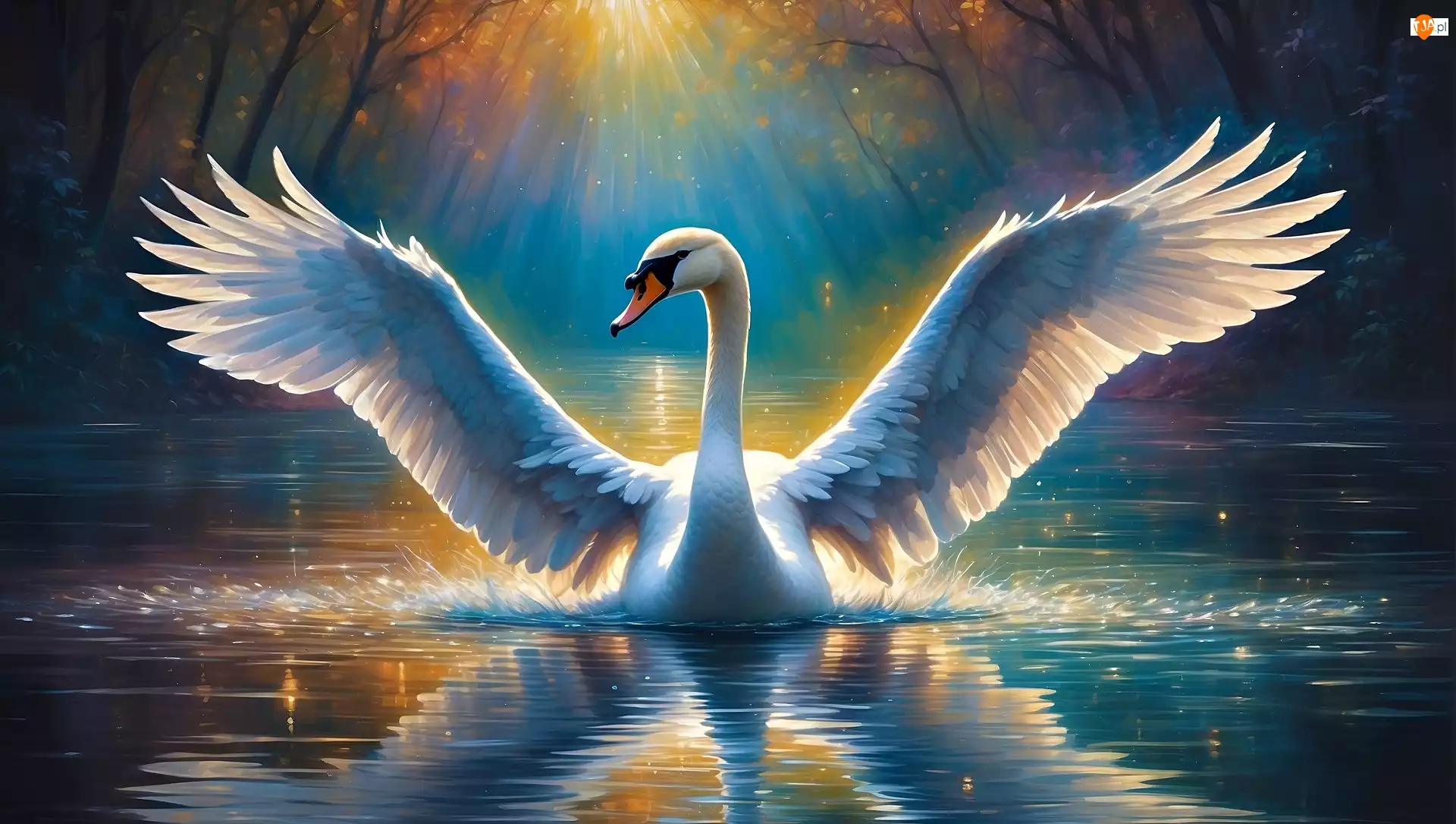 Biały, Łabędź, Grafika, Ptak, Promienie, Woda, Skrzydła