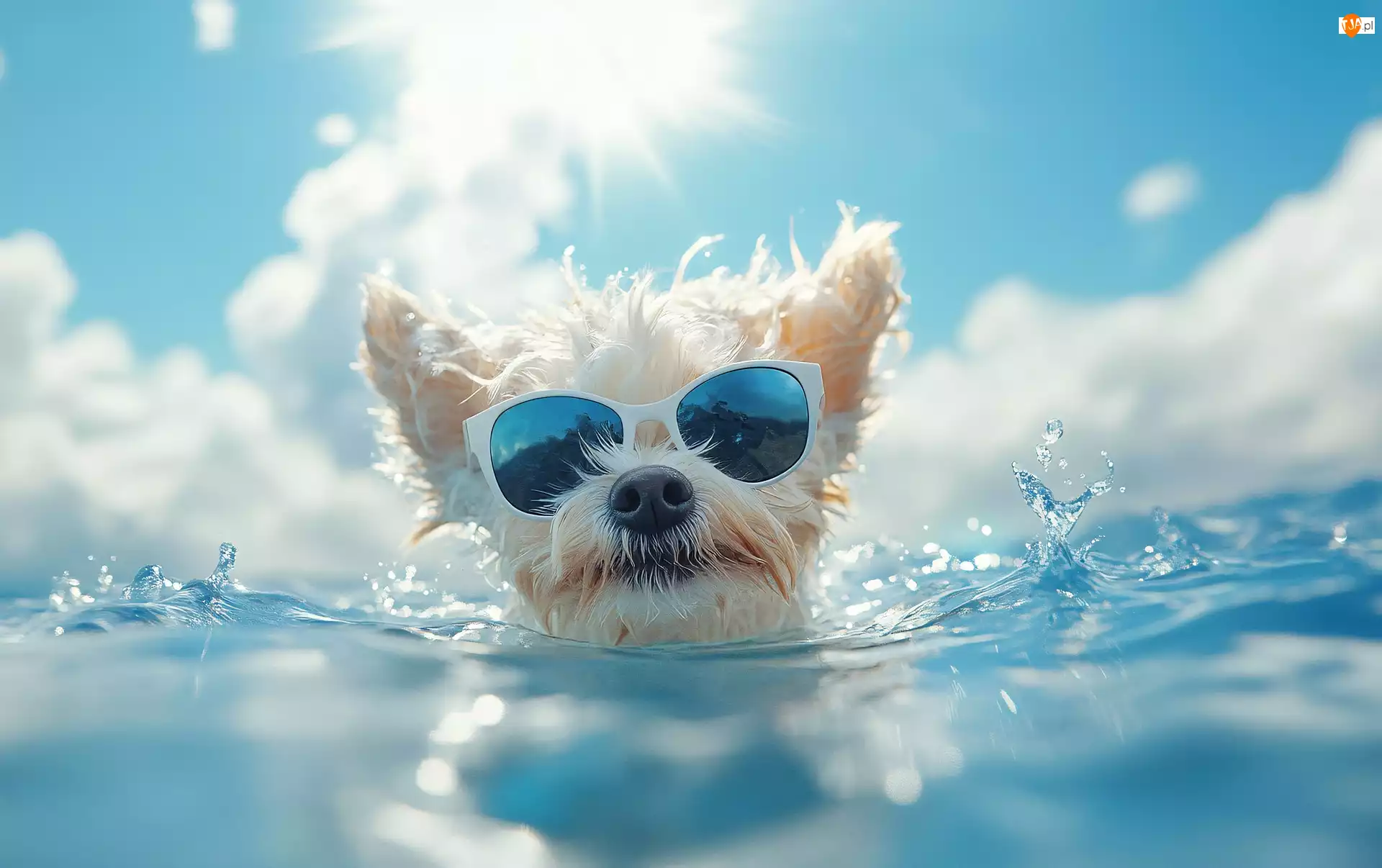 Biały pies w okularach przeciwsłonecznych pływa