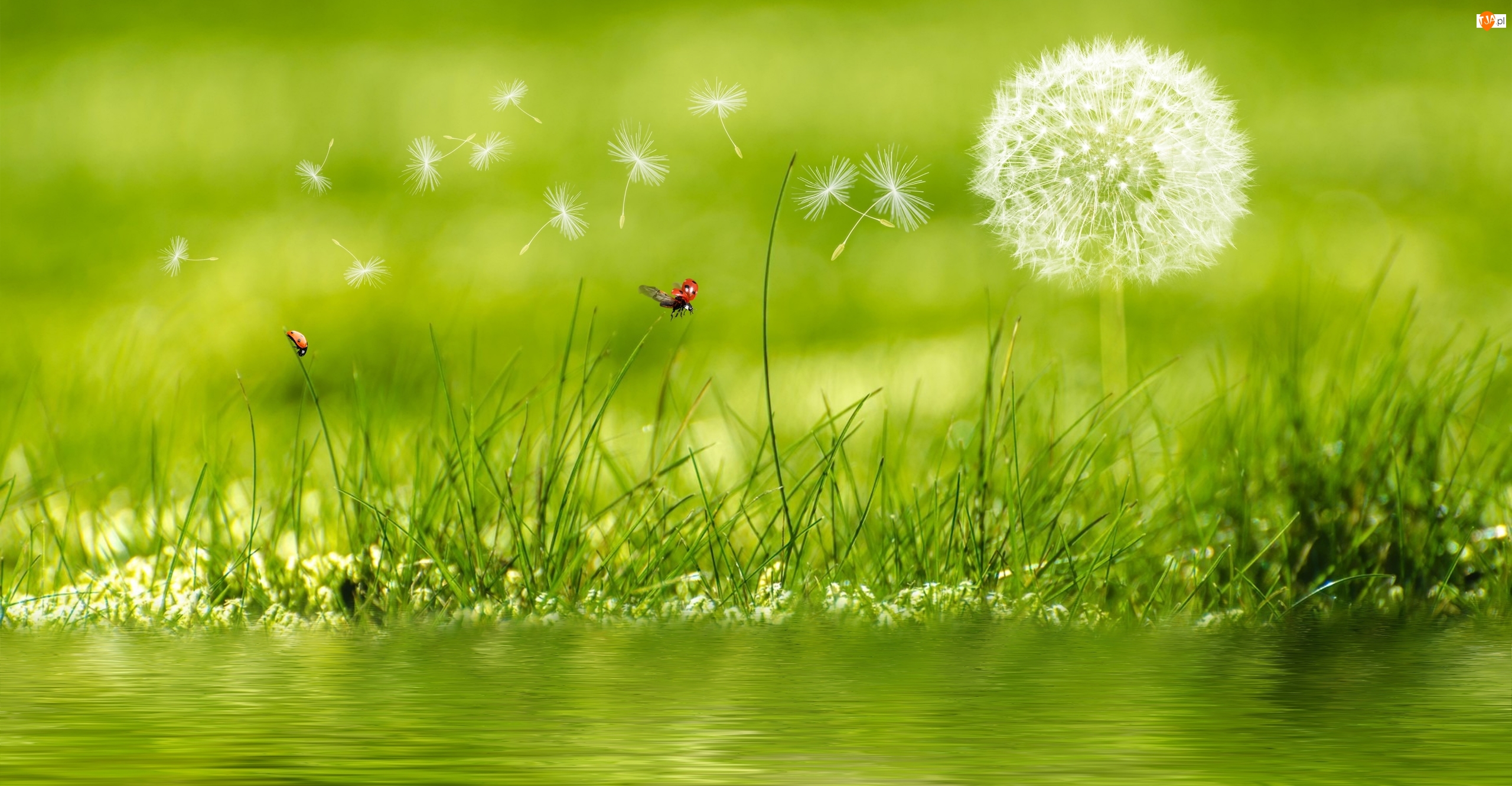 Biedronki, 2D, Trawa, Woda, Dmuchawiec