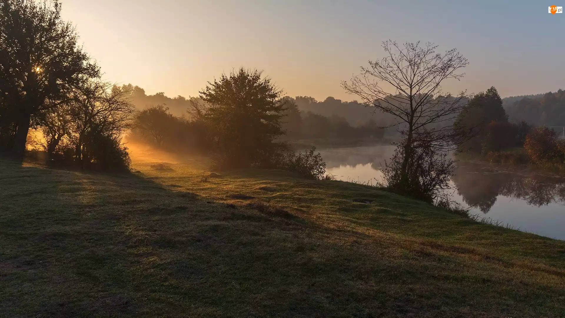 Mgła, Poranek, Słońca, Drzewa, Blask, Rzeka