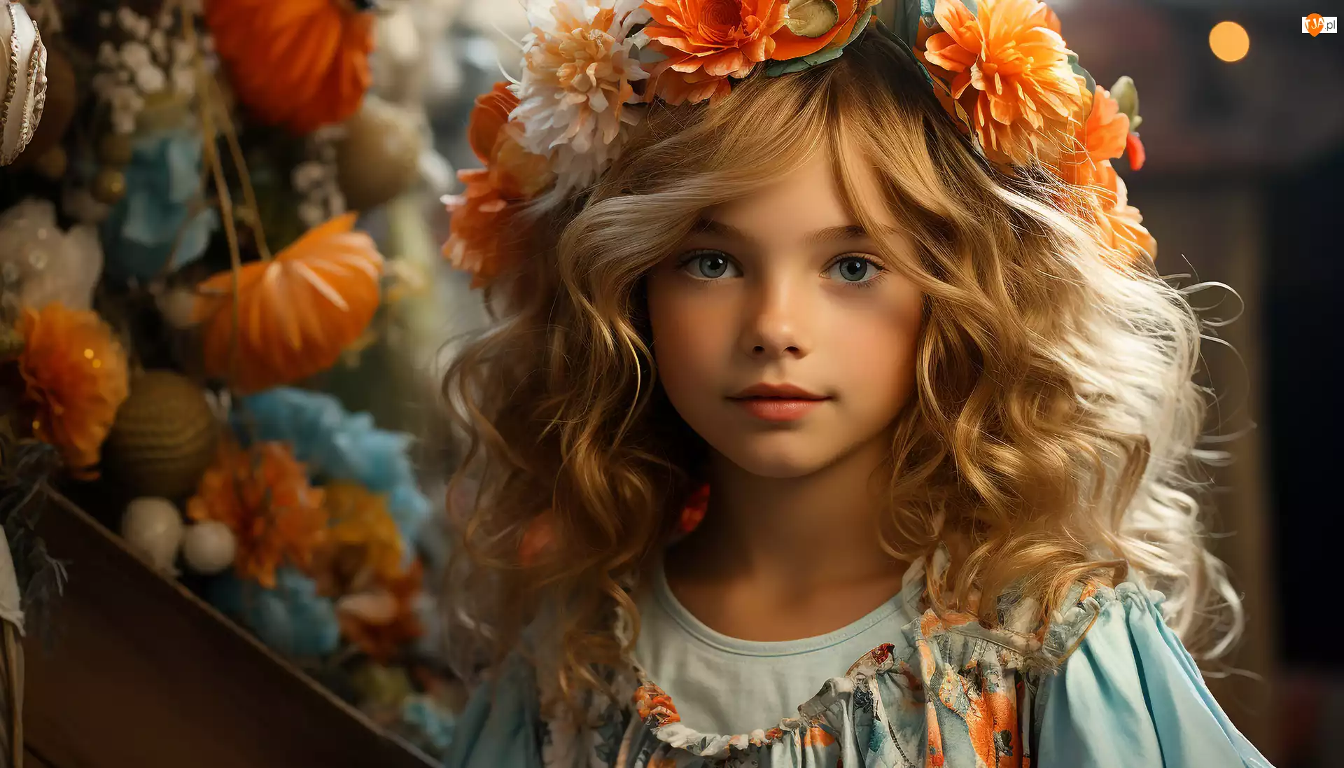Blondynka, Długie, Kwiaty, Dziewczynka, Wianek, Włosy, Kręcone