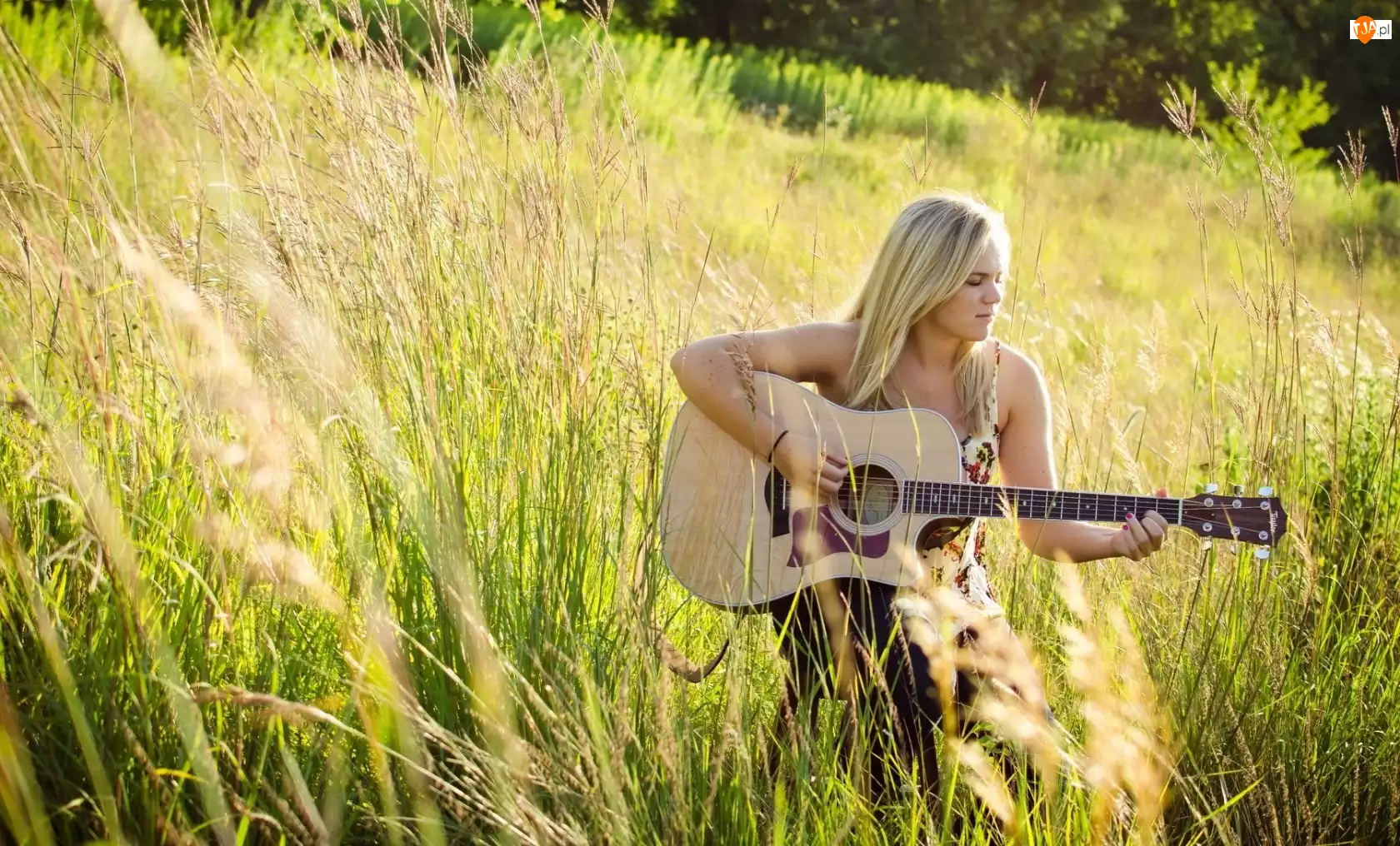 Blondynka, Gitara, Zboże, Pole, Kobieta