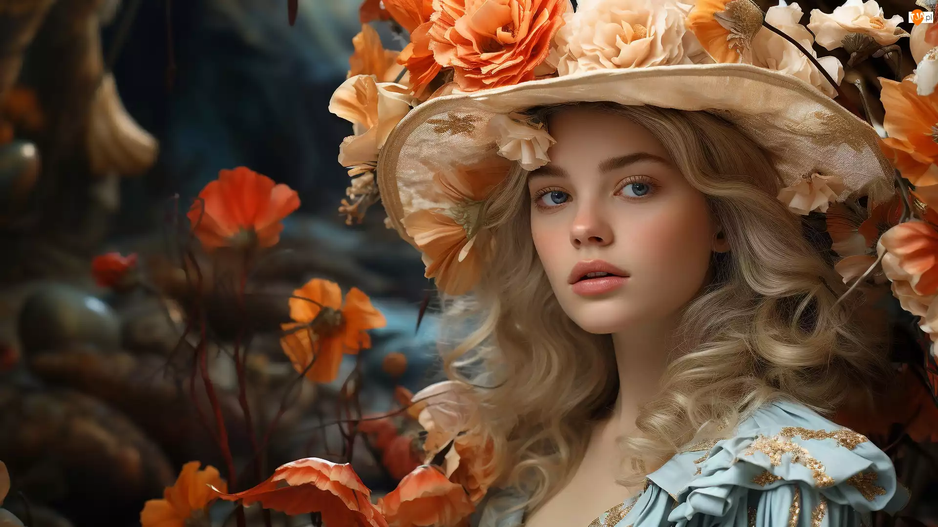 Blondynka, Kobieta, Kremowe, Kwiaty, Kapelusz, Pomarańczowe