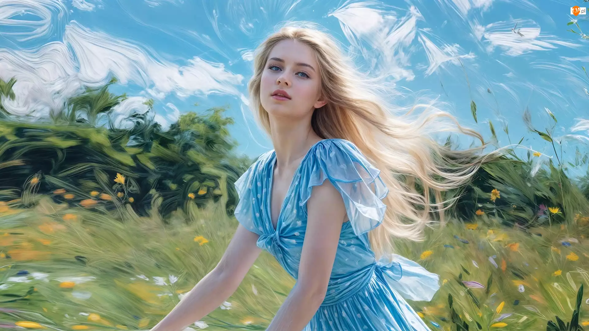 Blondynka, Łąka, Grafika, Kobieta, Sukienka, Niebieska, Lato