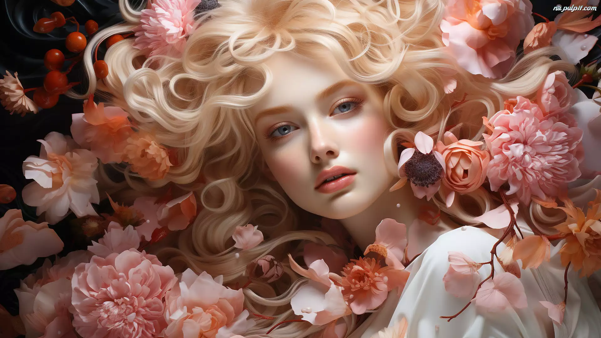 Blondynka otulona kwiatami