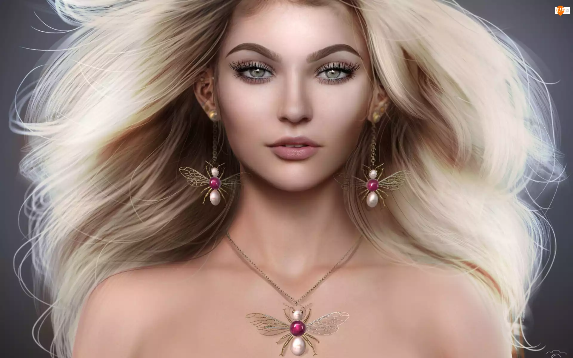 Blondynka, Kobieta, Naszyjnik, Grafika, Kolczyki, Motyl