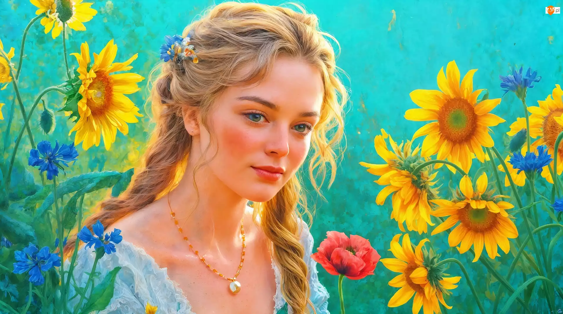 Blondynka z warkoczami oraz słoneczniki i chabry