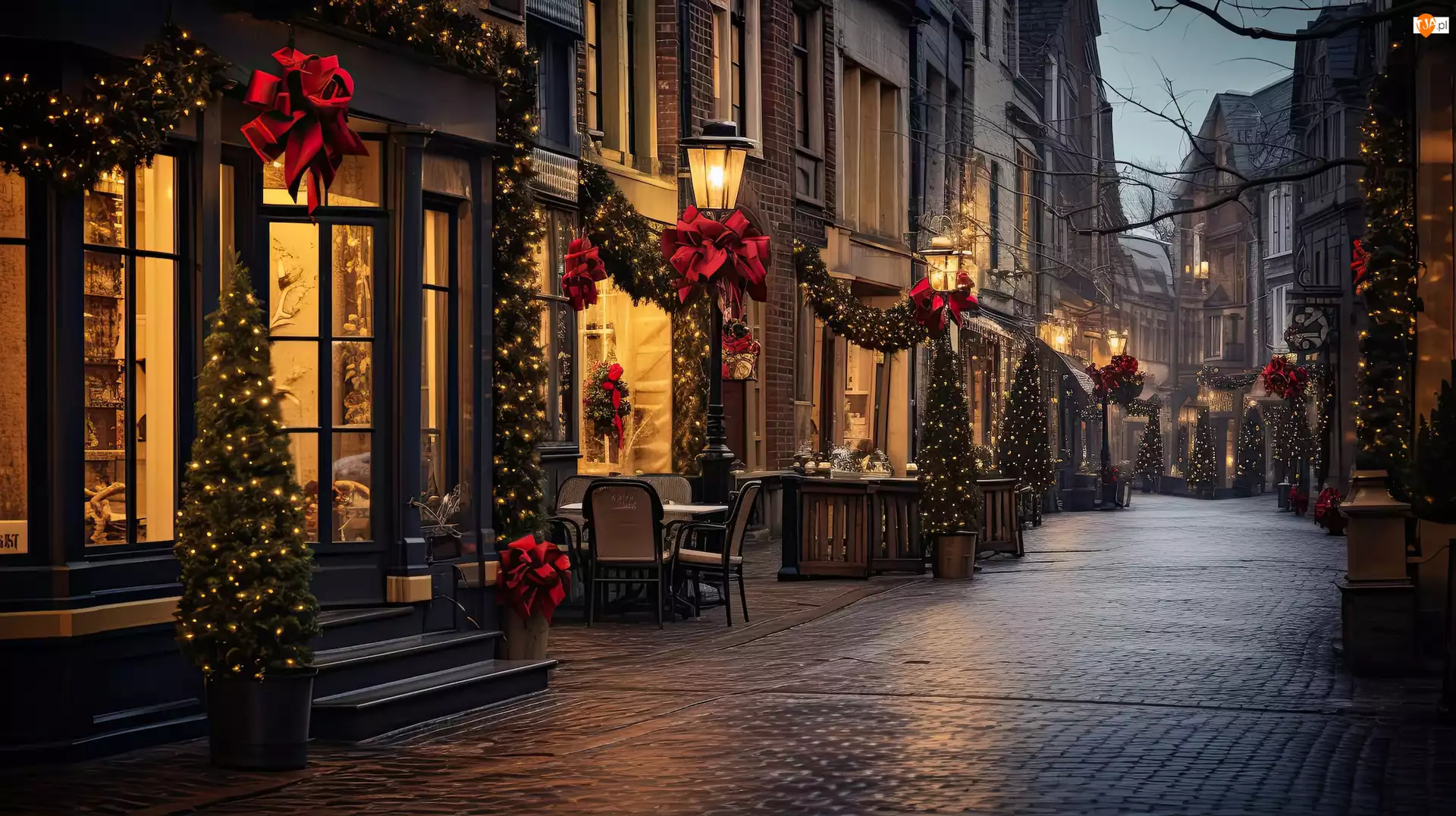 Boże Narodzenie, Grafika, Domy, Choinki, Miasto, Dekoracje, Latarnie, Ulica