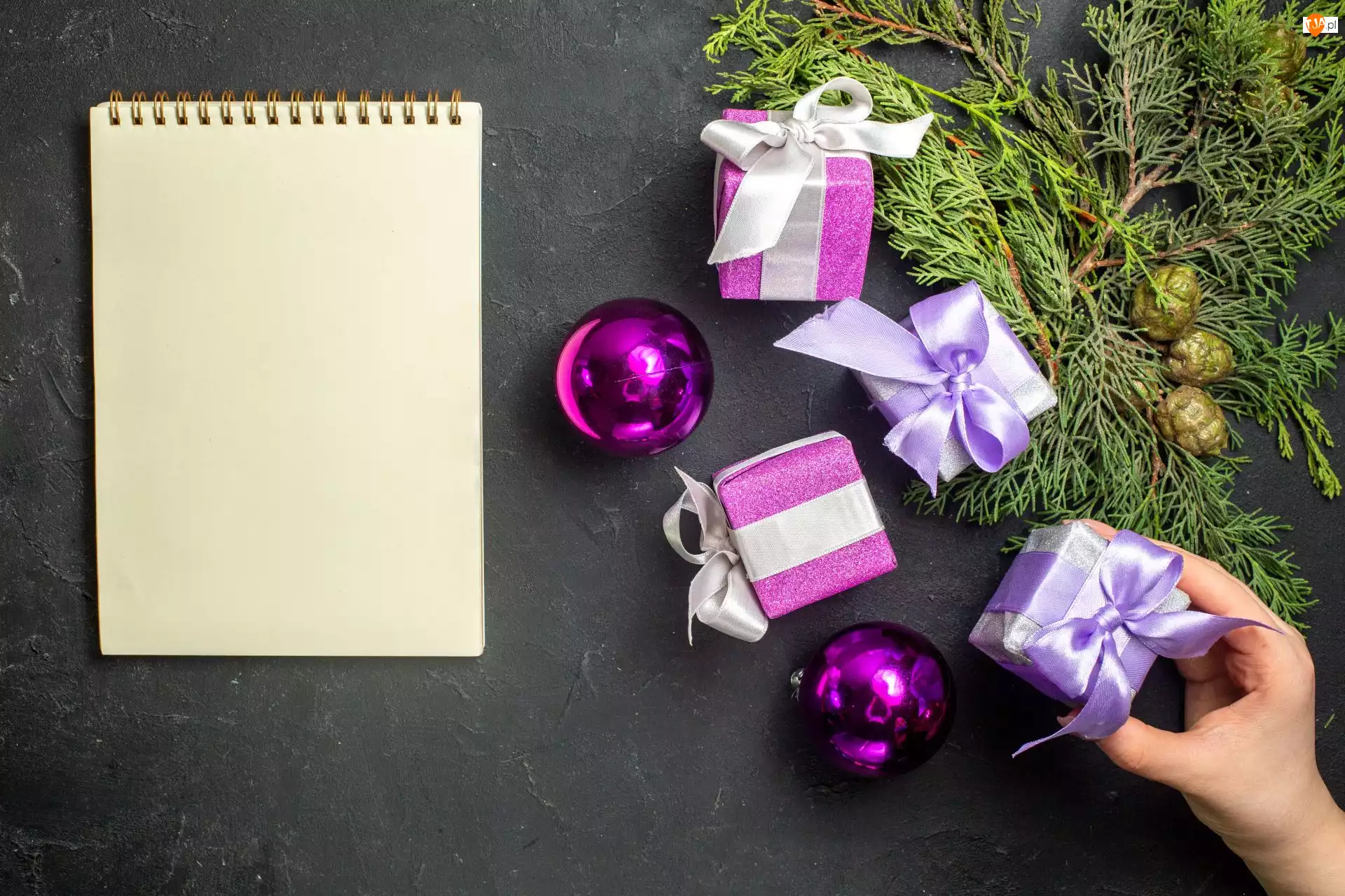 Bombki, Kompozycja, Ręka, Notatnik, Gałązki, Prezenty, Świąteczne, Szyszki