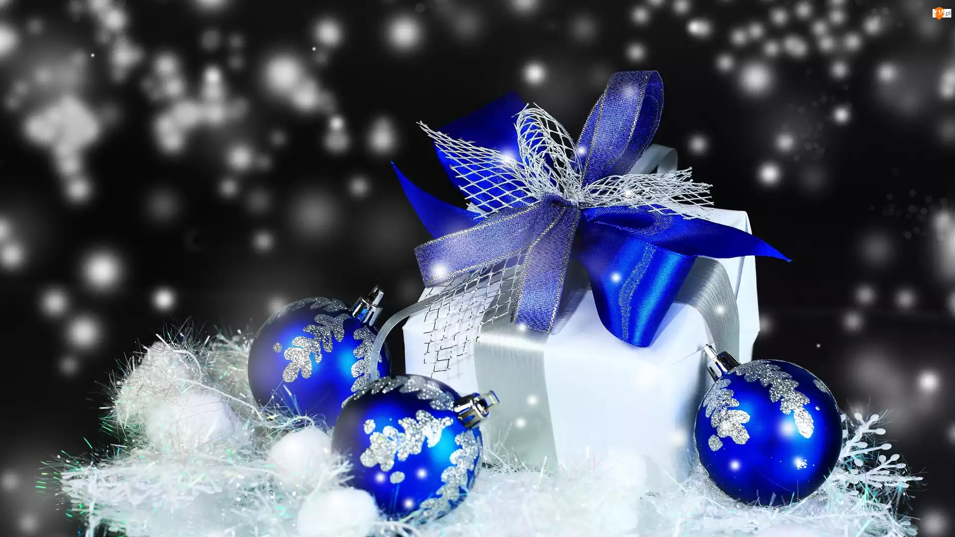 Śnieg, Bombki, Prezent, Kompozycja, Ciemne tło, Wstążka, Niebieskie
