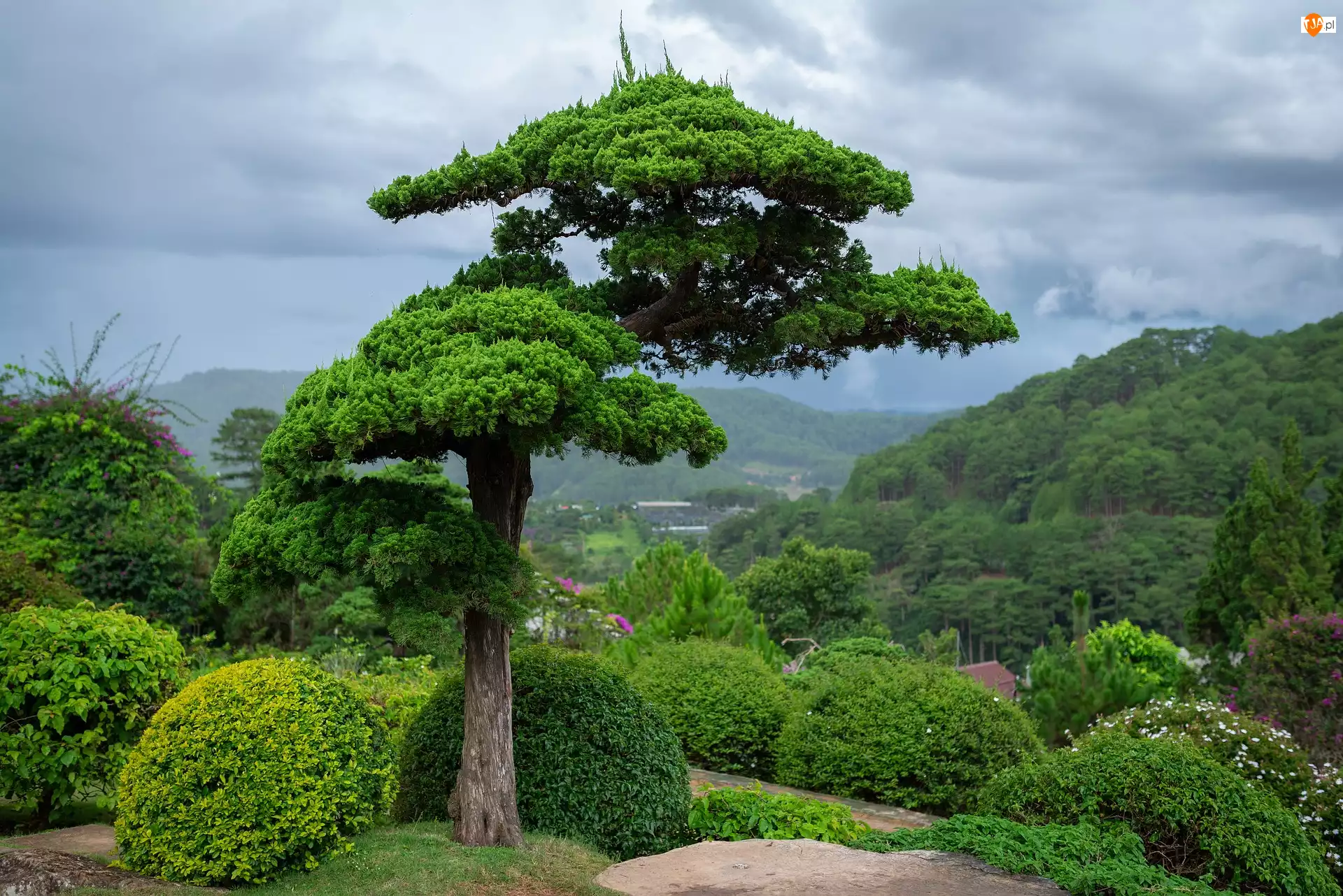 Drzewo, Cedr, Krzewy, Góra, Chmury, Niebo, Bonsai