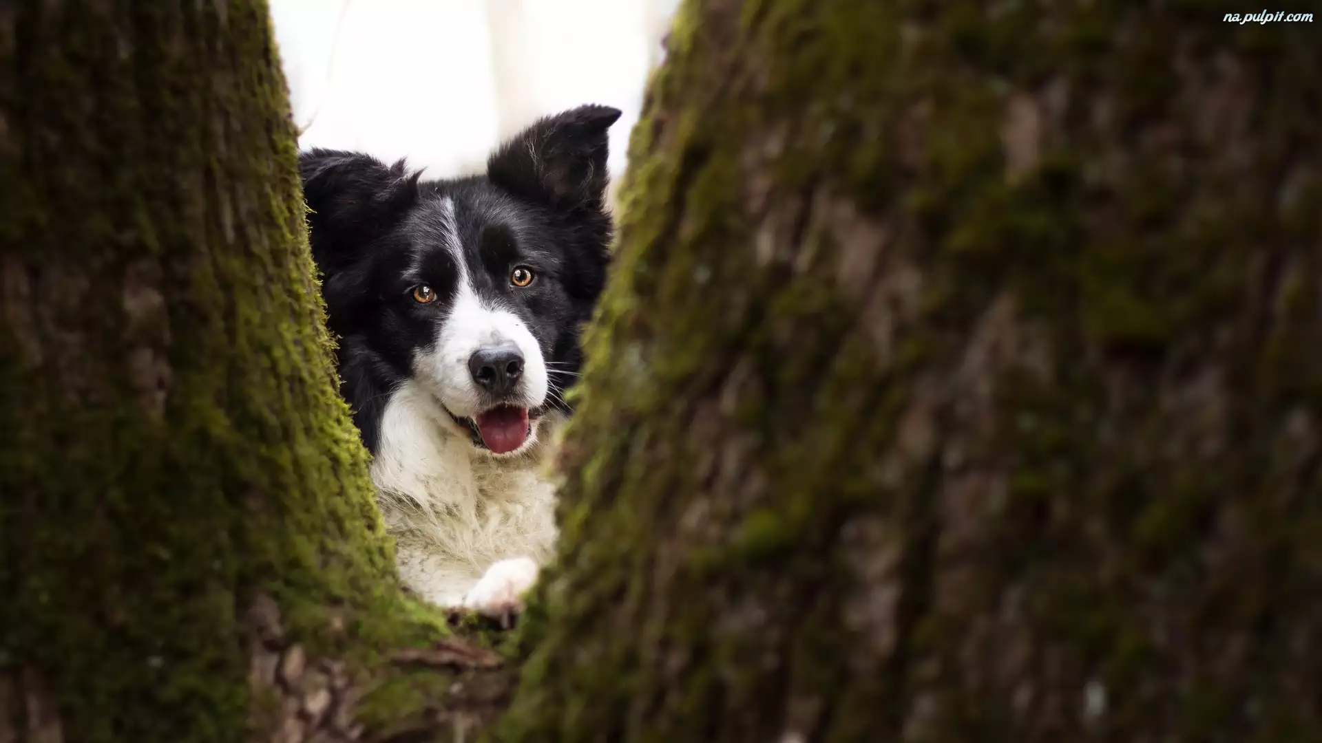 Border collie patrzący zza drzewa