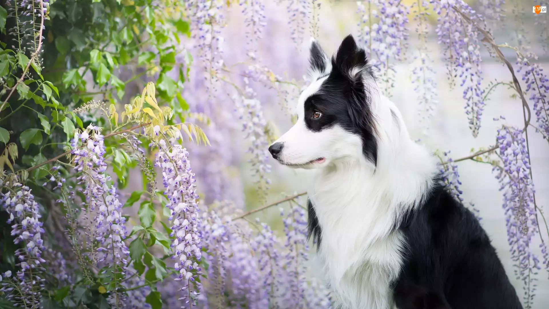 Border collie pośród kwiatów glicynii