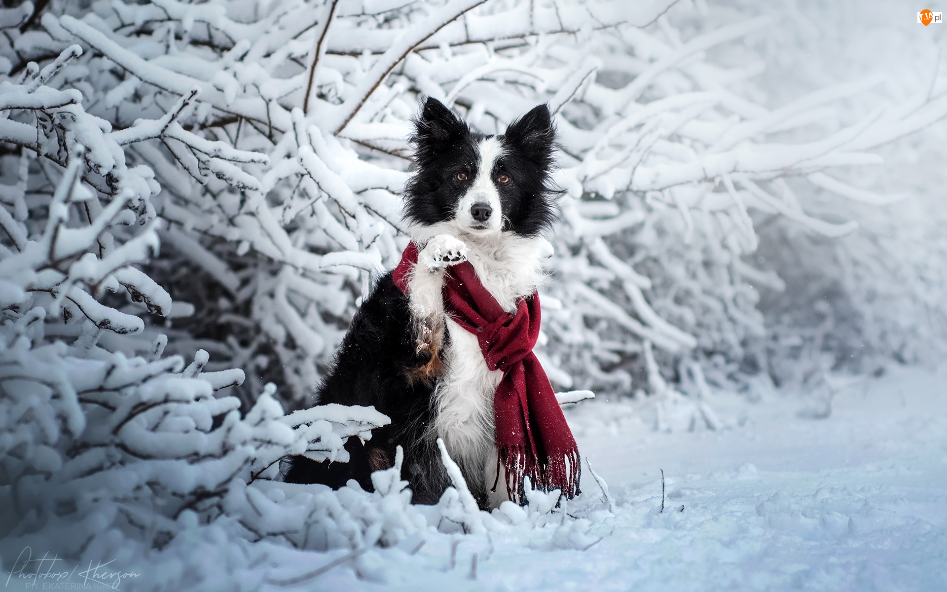 Pies, Border collie, Zima, Biało-czarny, Gałązki, Ośnieżone, Szalik