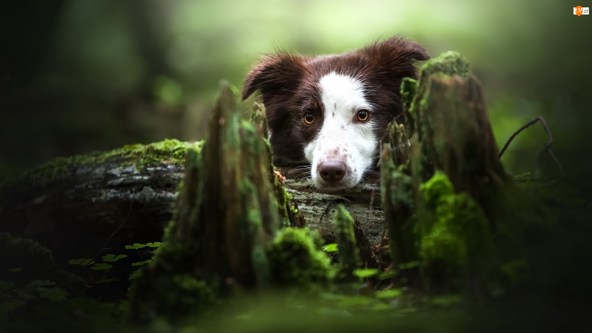 Spróchniały, Mech, Biało-brązowy, Border collie, Pień