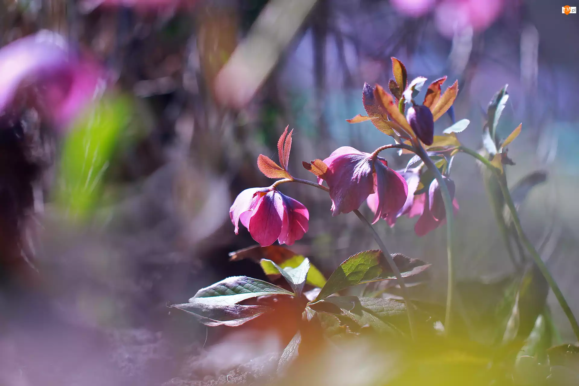 Bordowe kwiaty Ciemierniki w blasku słońca
