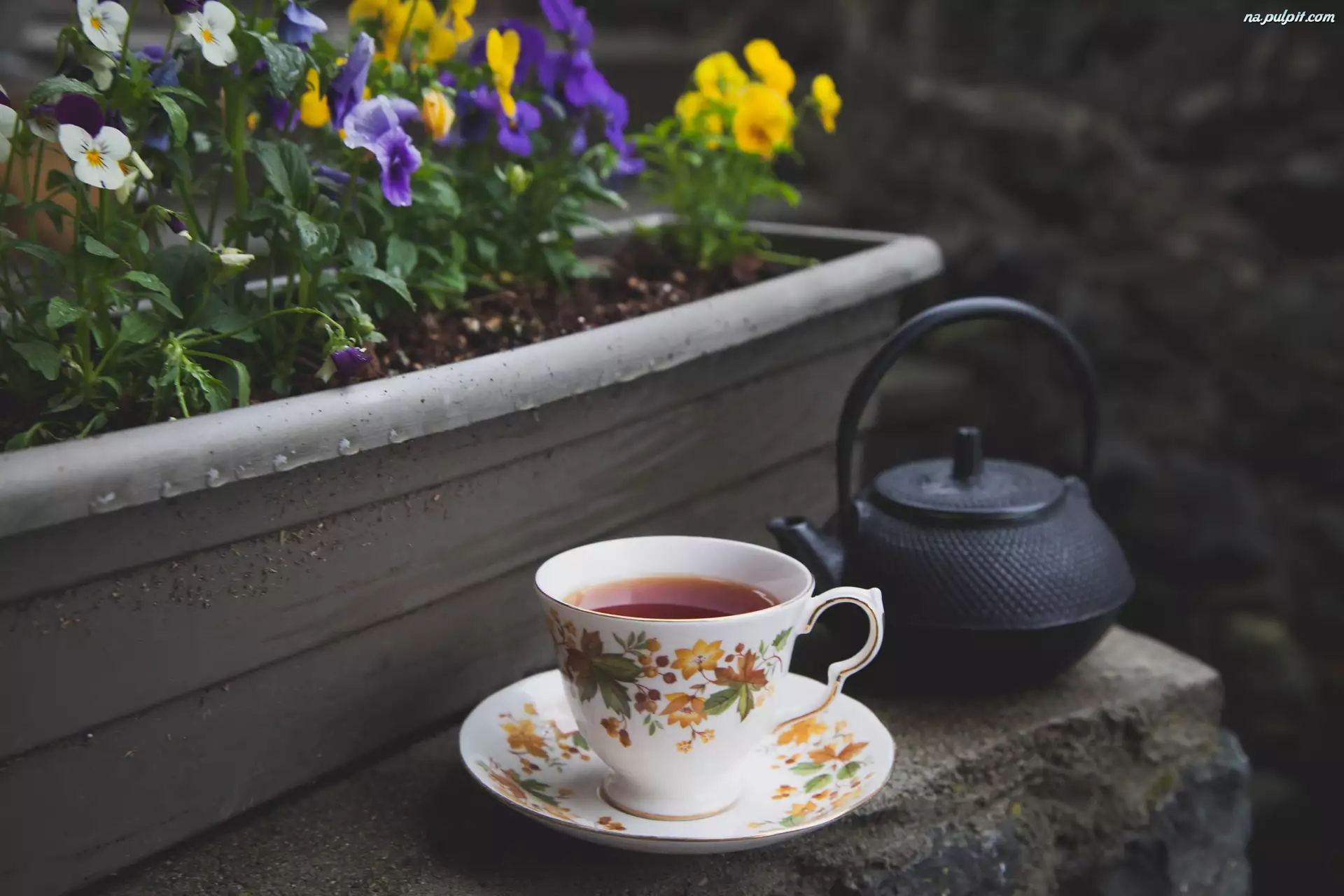 Czajnik, Bratki, Talerzyk, Filiżanka, Herbata