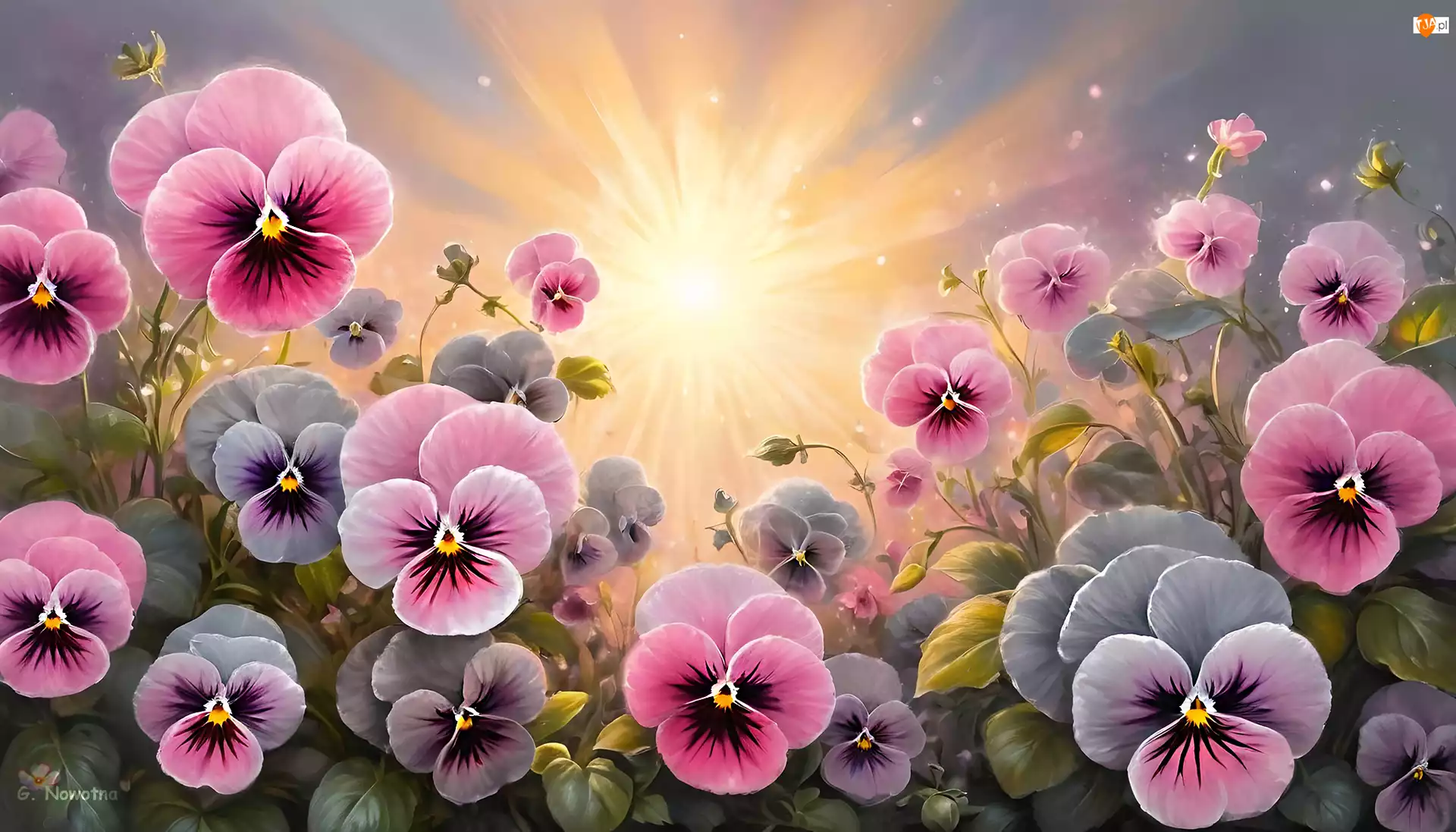 Bratki, Grafika, Szare, Różowe, Kwiaty