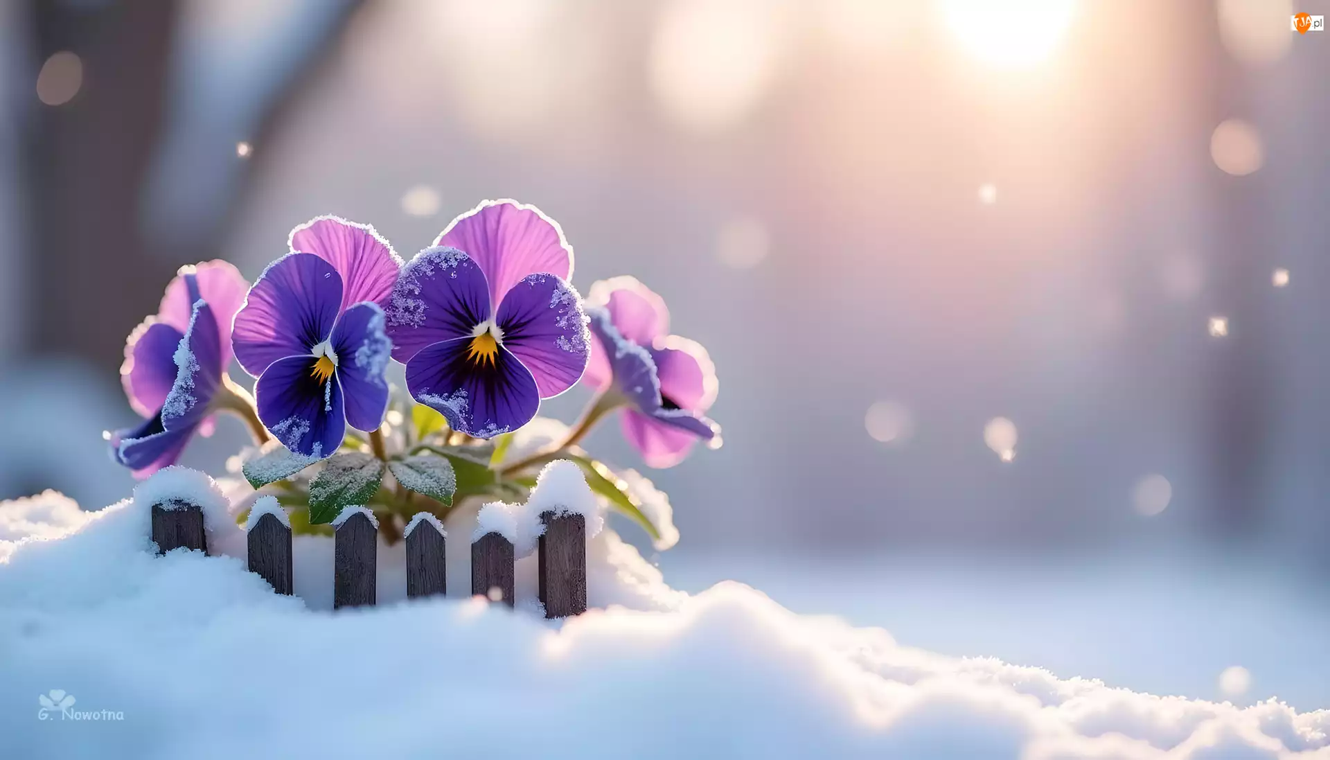 Bratki, Kwiaty, Grafika, Fioletowe, Zima, Śnieg, Płotek