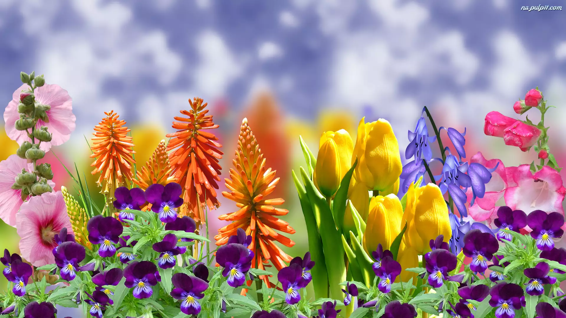 Tulipany, Malwa, Bratki, Kwiaty, Trytoma groniasta