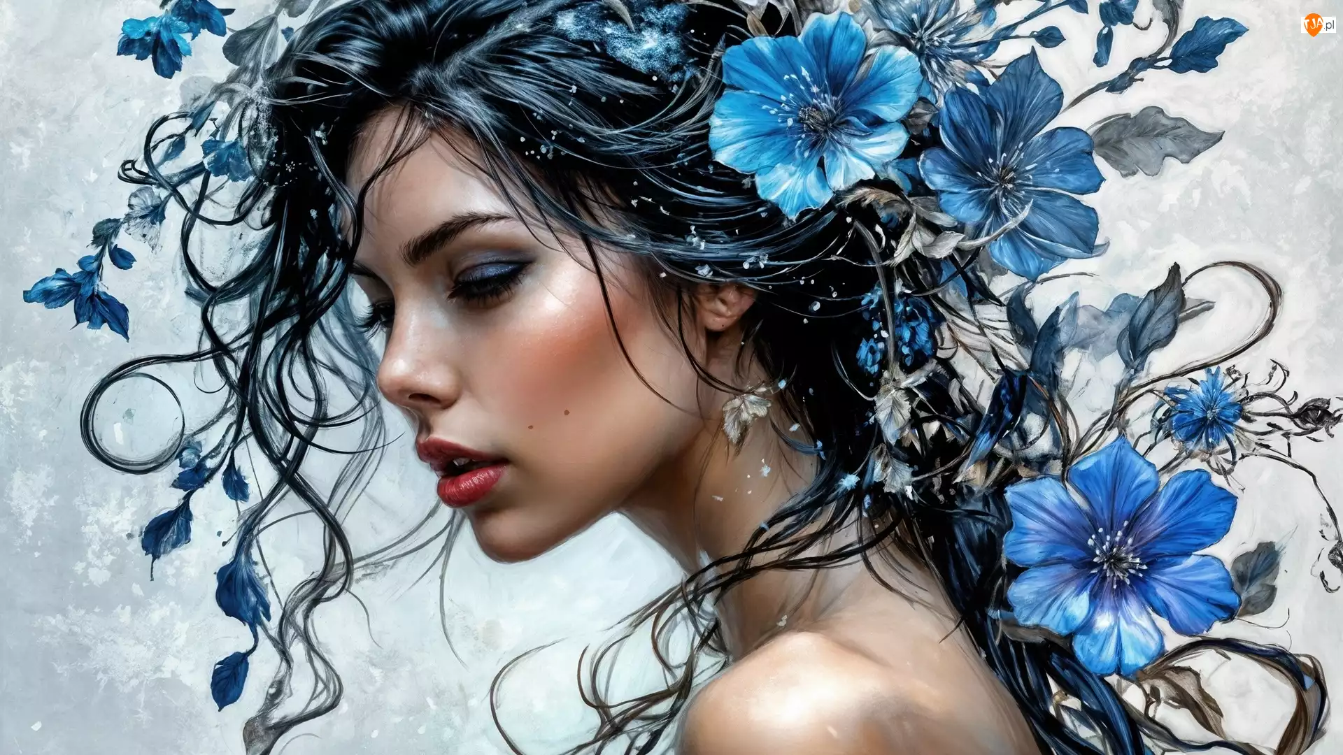 Brunetka, Ciemne, Grafika, Dziewczyna, Kwiaty, Niebieskie, Włosy