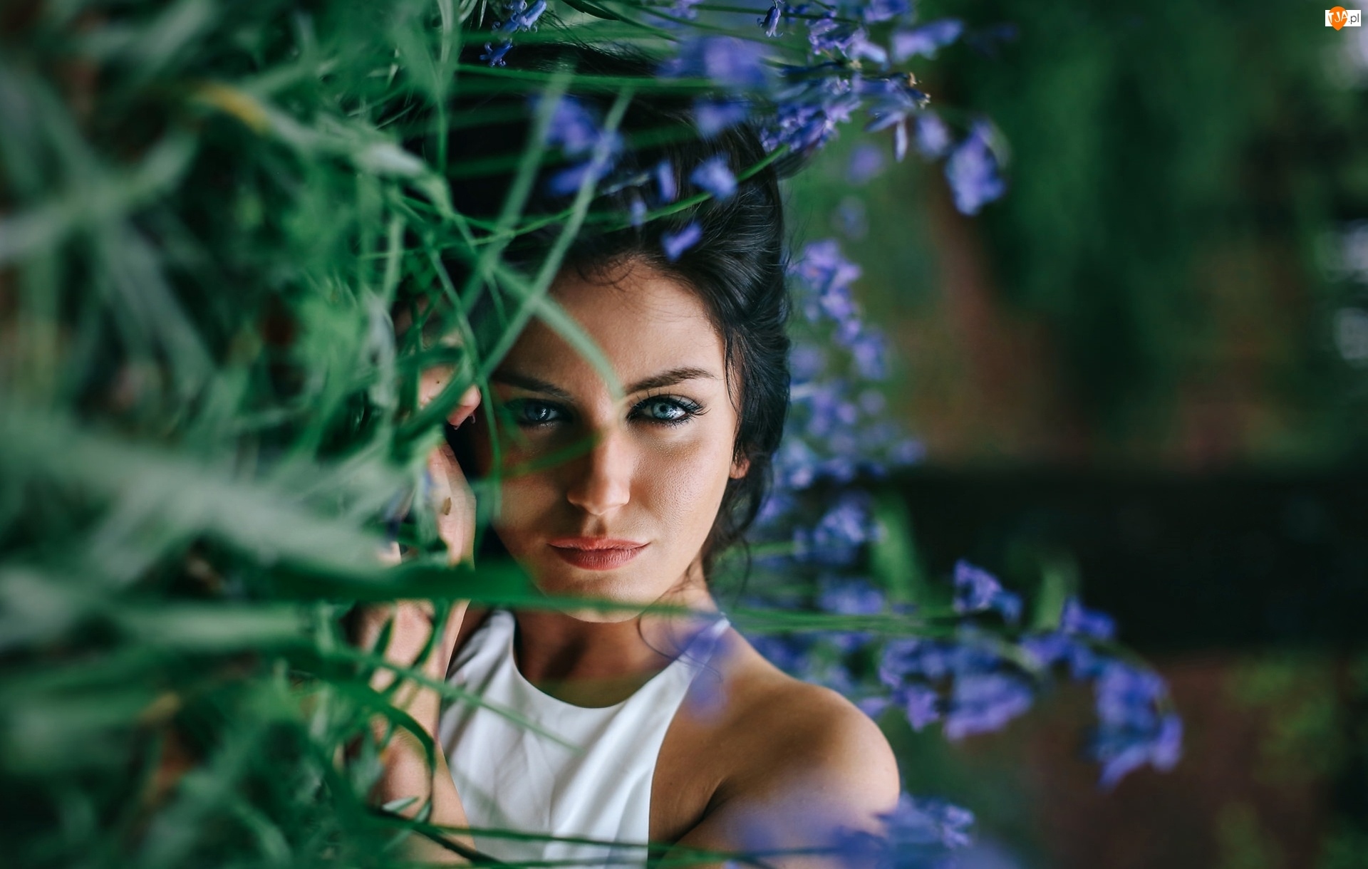Brunetka, Kwiaty, Makijaż, Niebieskie