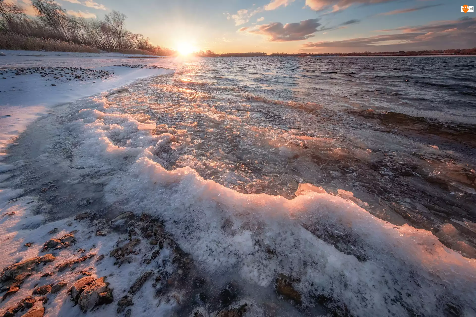 Rzeka, Wołga, Promienie słońca, Rosja, Drzewa, Zima, Lód