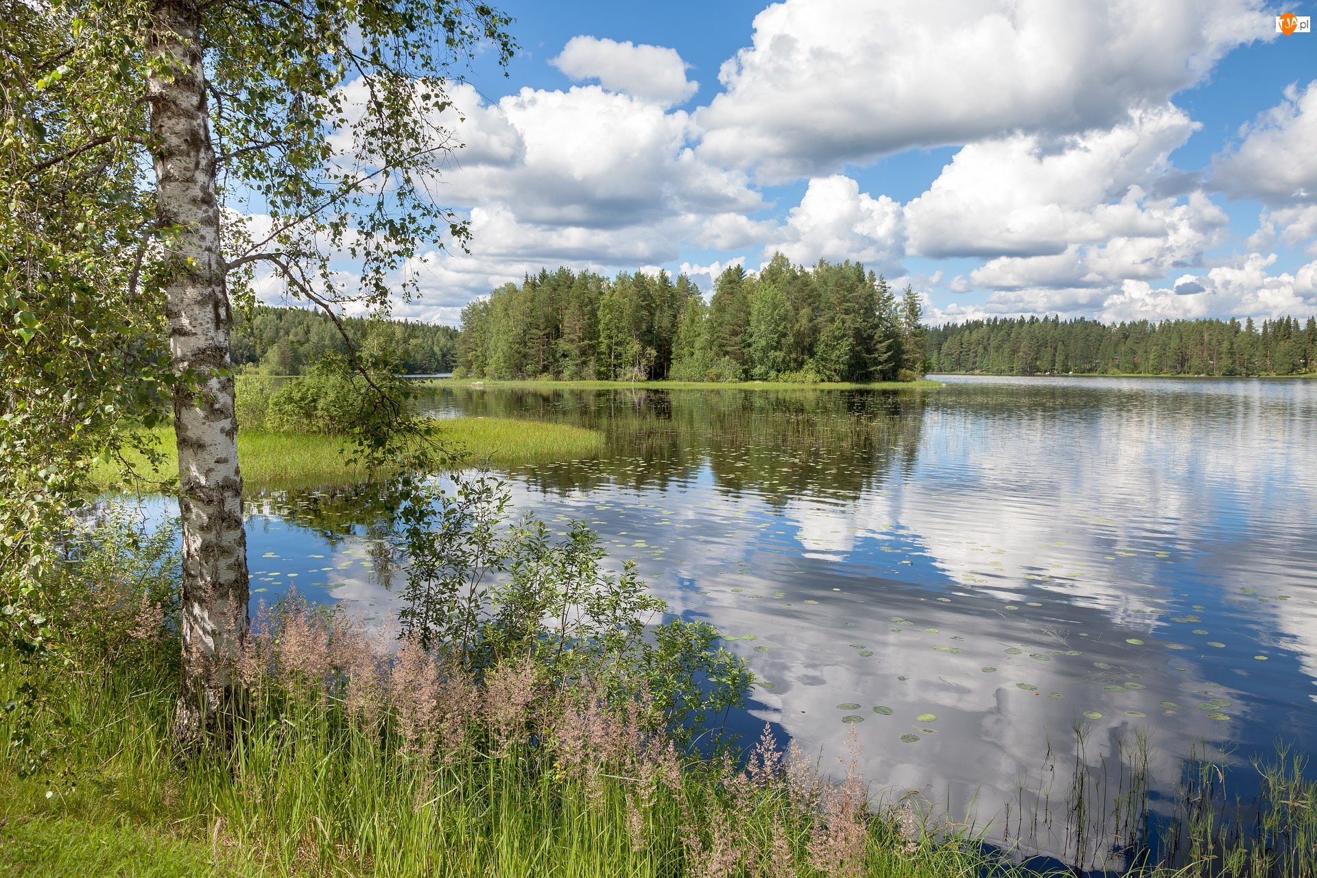 Drzewa, Jezioro, Brzoza, Odbicie, Las, Chmury