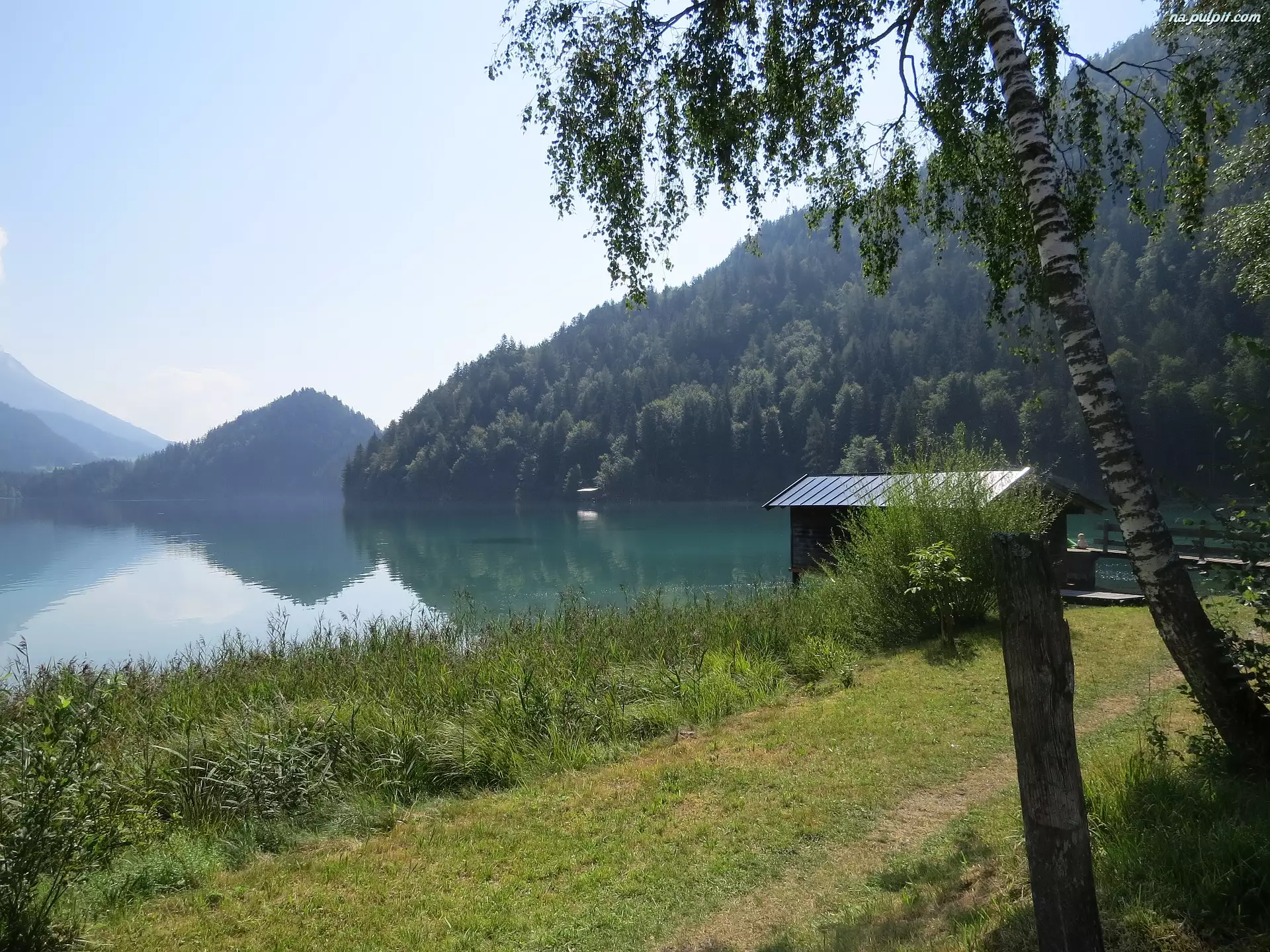 Austria, Jezioro Hintersteinersee, Tyrol, Trawa, Las, Przystań, Drzewa, Góry, Brzoza