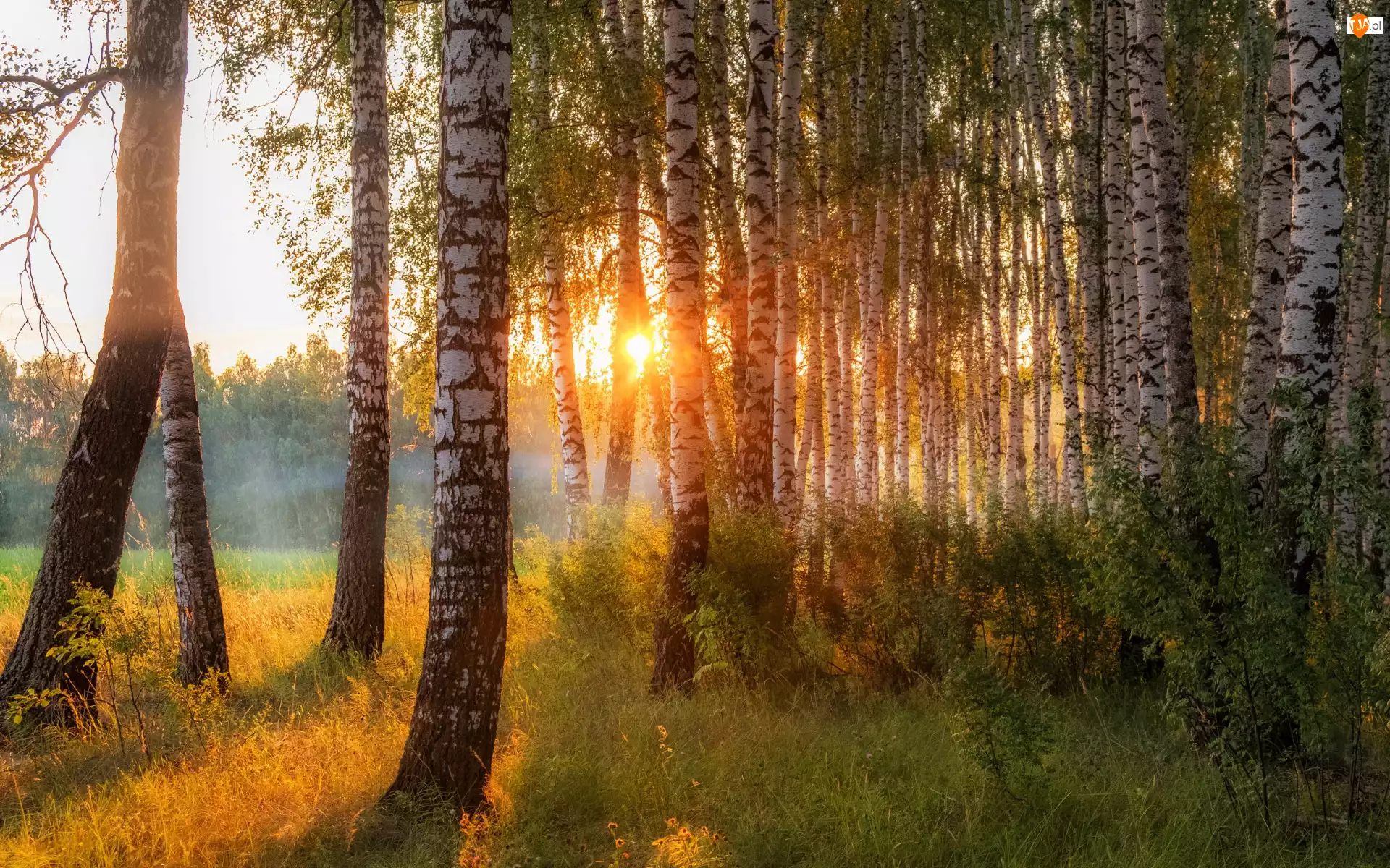 Słoneczny, Mgła, Brzozy, Las, Blask