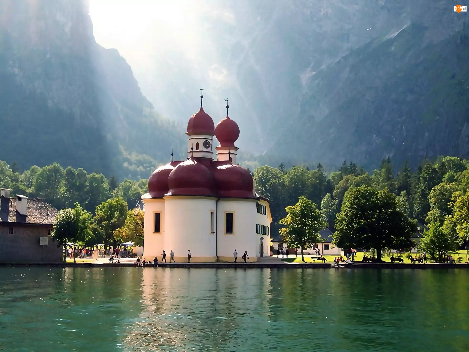 Góry, Jezioro, Drzewa, Bawaria, Budynek, Kościół, Koenigssee