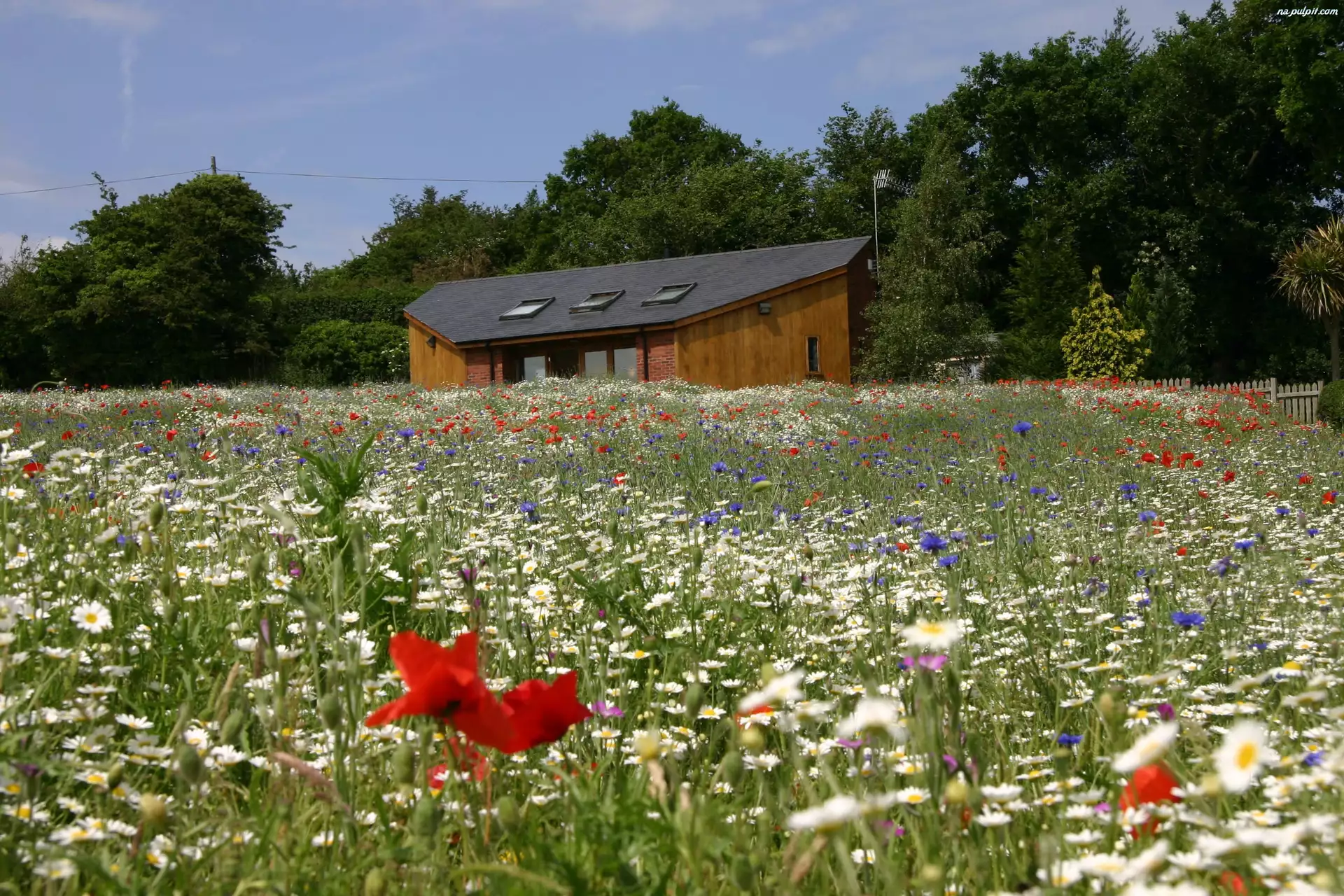 Budynek, Łąka, Margerytki, Chabry, Maki