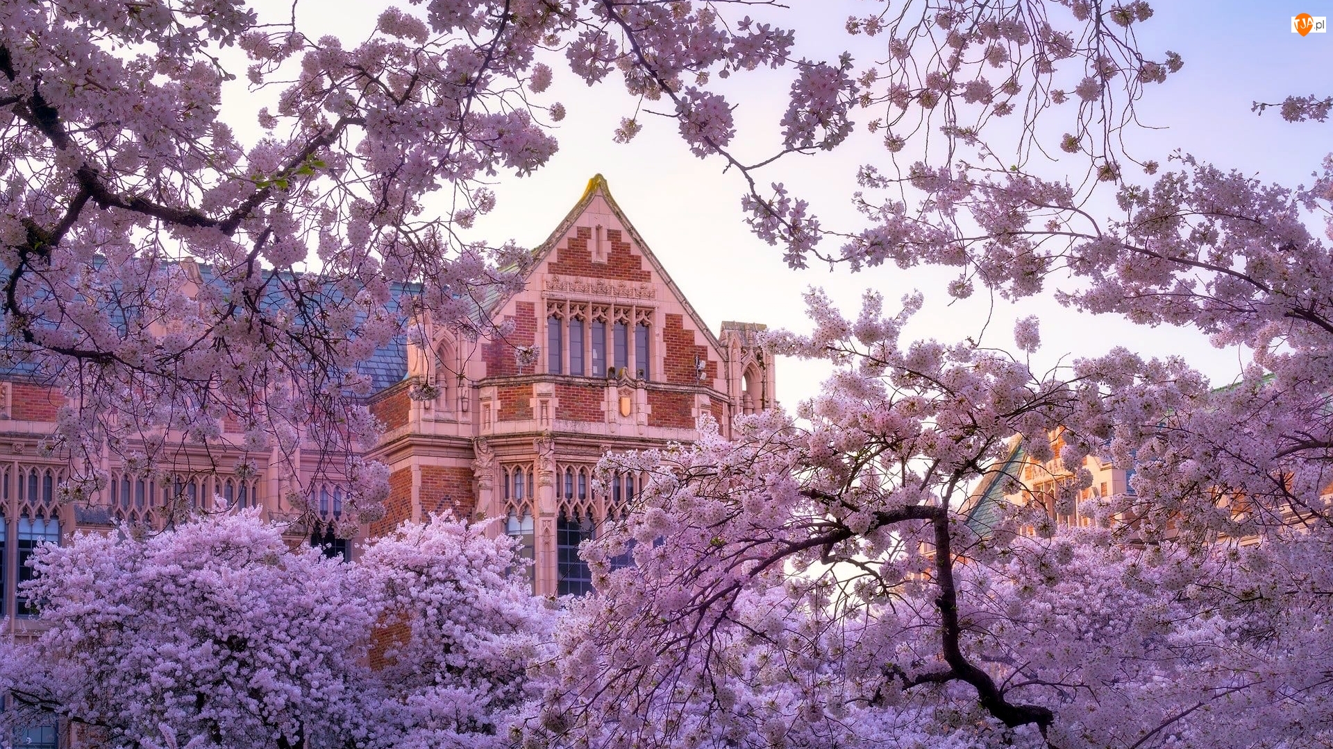 Drzewa owocowe, Stany Zjednoczone, Waszyngton, Gałęzie, Stan Waszyngton, Budynek, Kwiaty, Uniwersytet Quad
