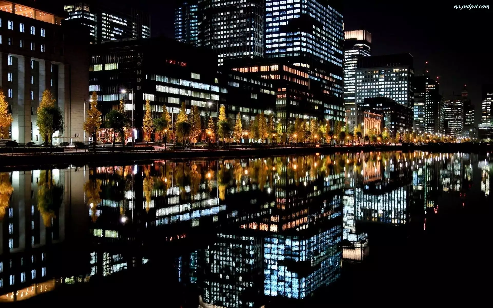 Budynki, Rzeka, Nocą, Miasto, Odbicie