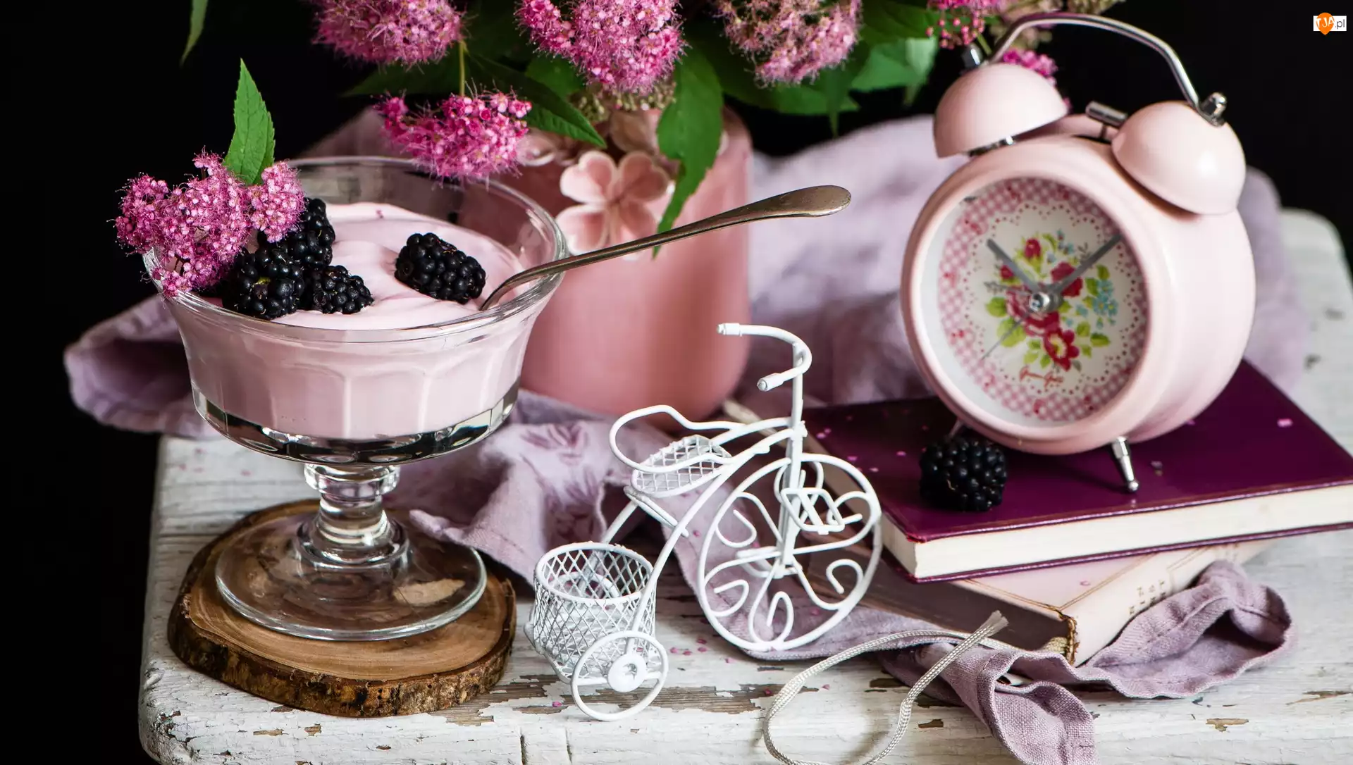 Budzik, Kompozycja, Kwiaty, Książka, Rower, Deser