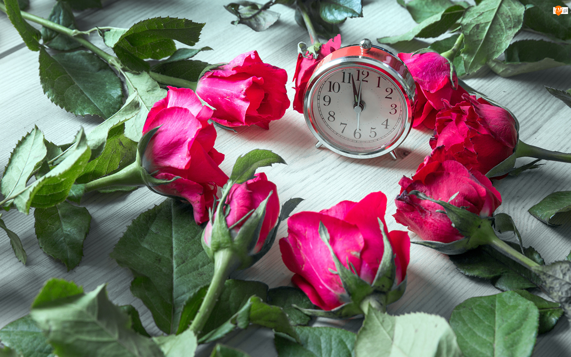 Budzik otoczony czerwonymi różami