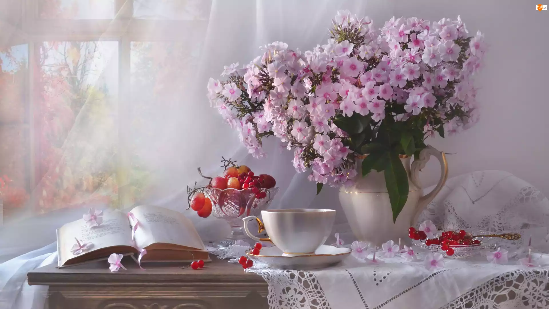 Kompozycja, Winogrona, Czerwona porzeczka, Książka, Bukiet, Kwiaty, Dzbanek, Floksy, Filiżanka, Serweta