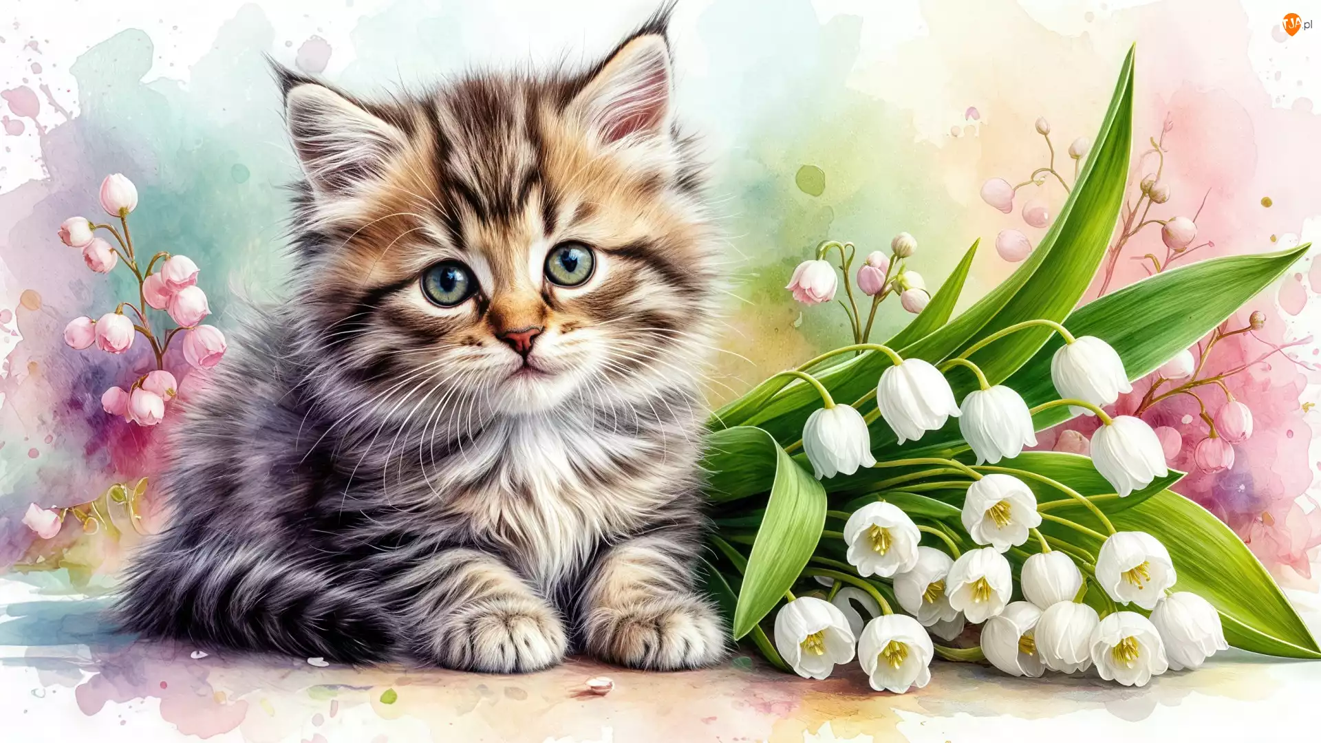 Kwiaty, Grafika, Kot, Mały, Konwalie