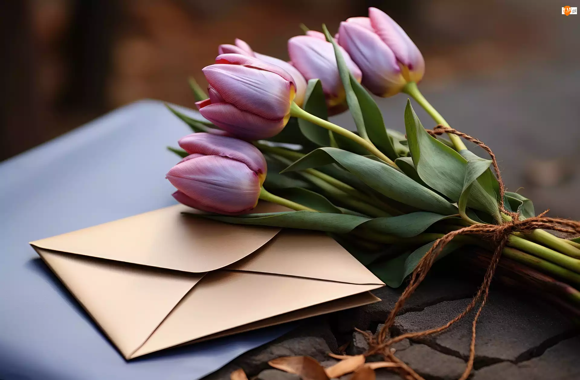Bukiet, Koperty, Tulipany, Fioletowe, Sznurki