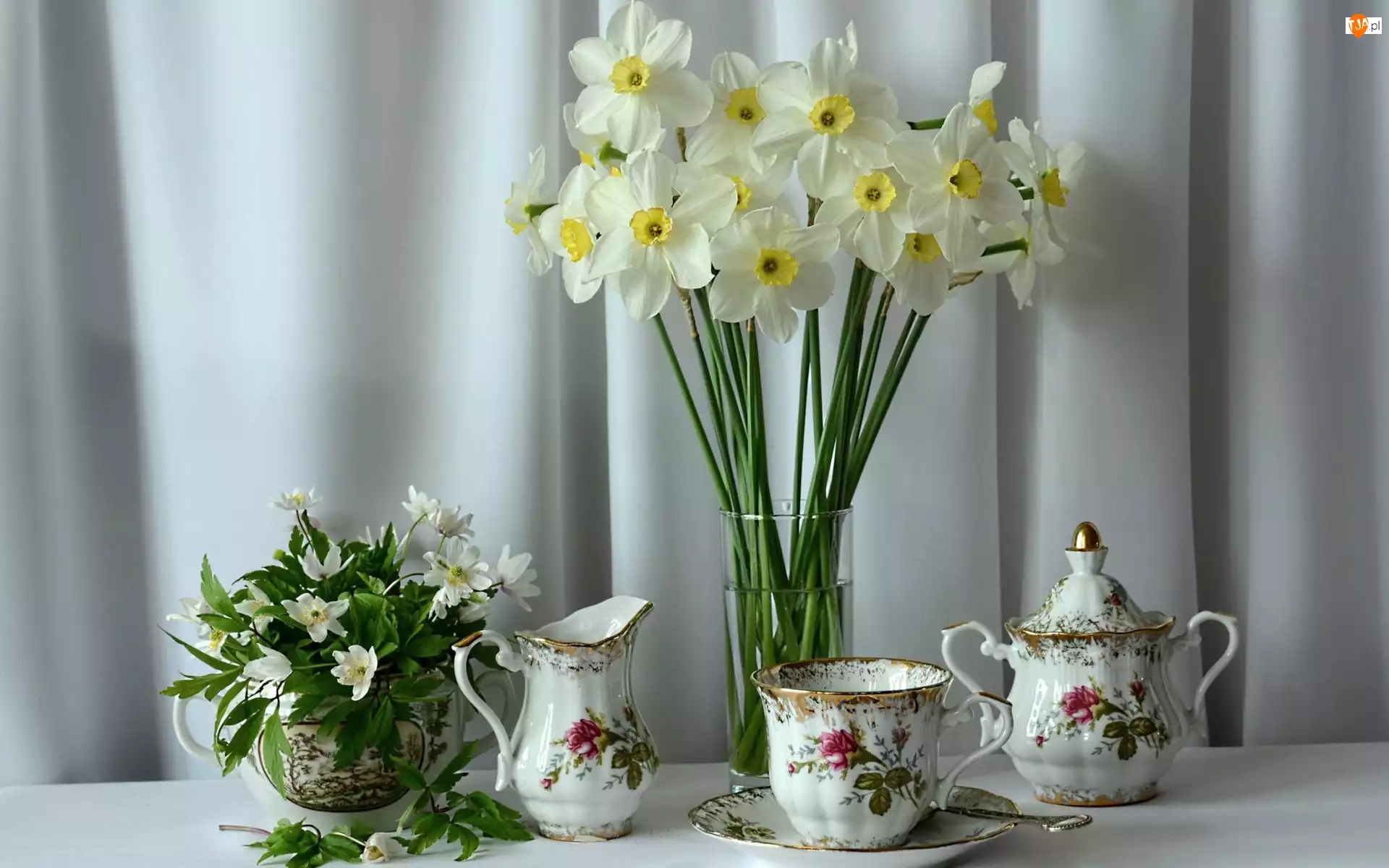 Bukiet, Porcelana, Białe, Kompozycja, Kwiaty, Żonkile