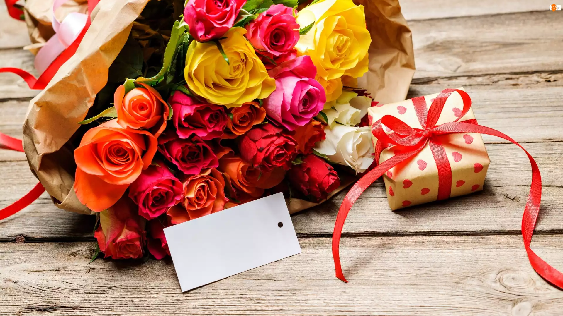 Bukiet róż i prezent na deskach