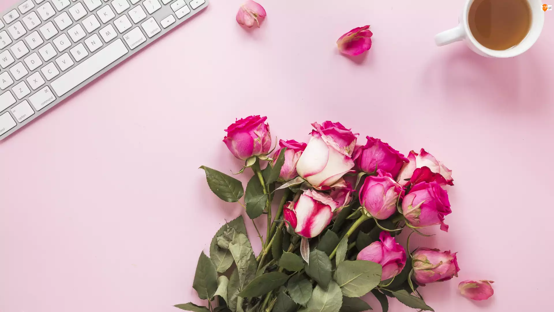 Klawiatura, Różowe tło, Bukiet, Róże, Kubek