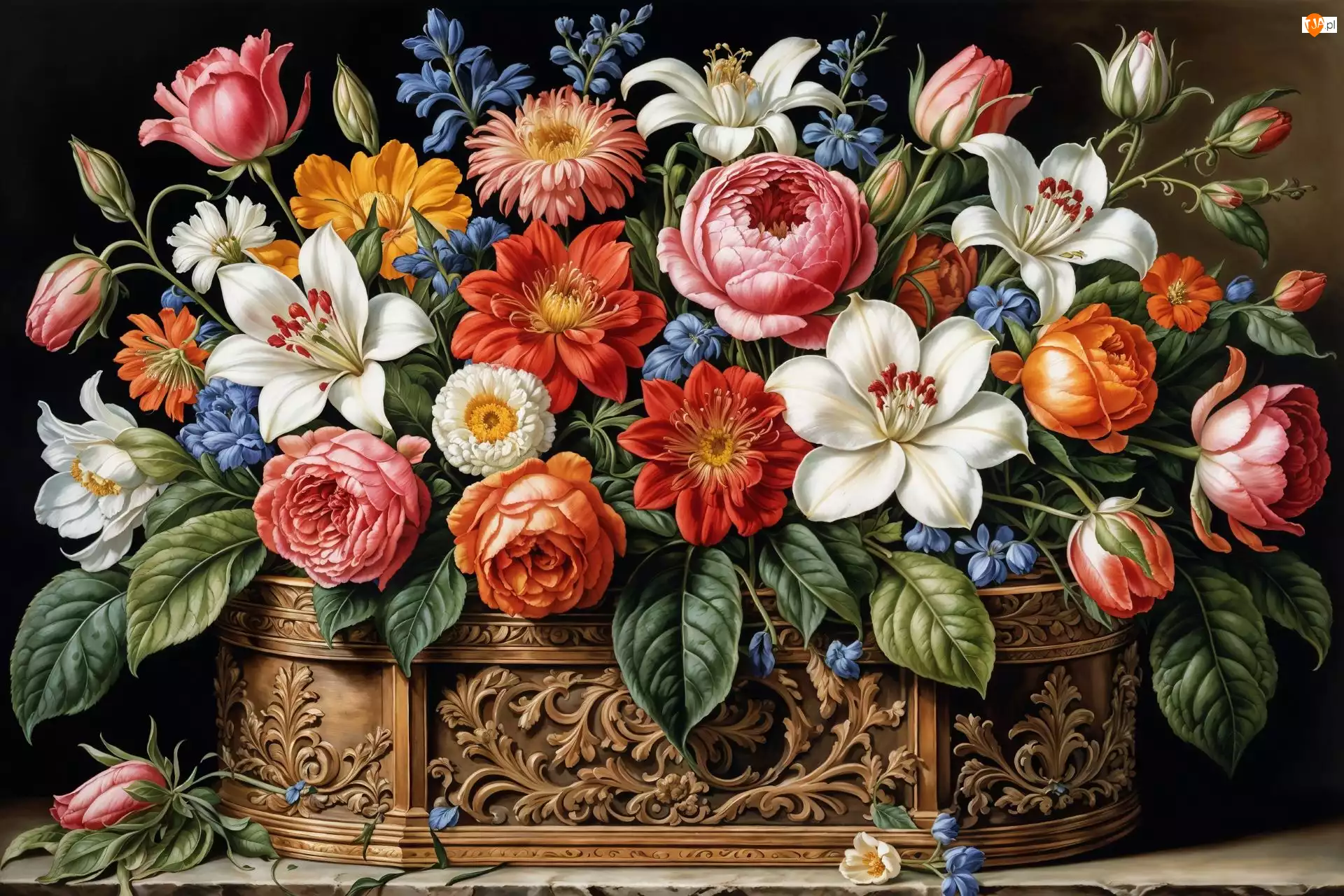 Bukiet, Skrzynka, Różnokolorowe, Kwiaty, Ozdobna