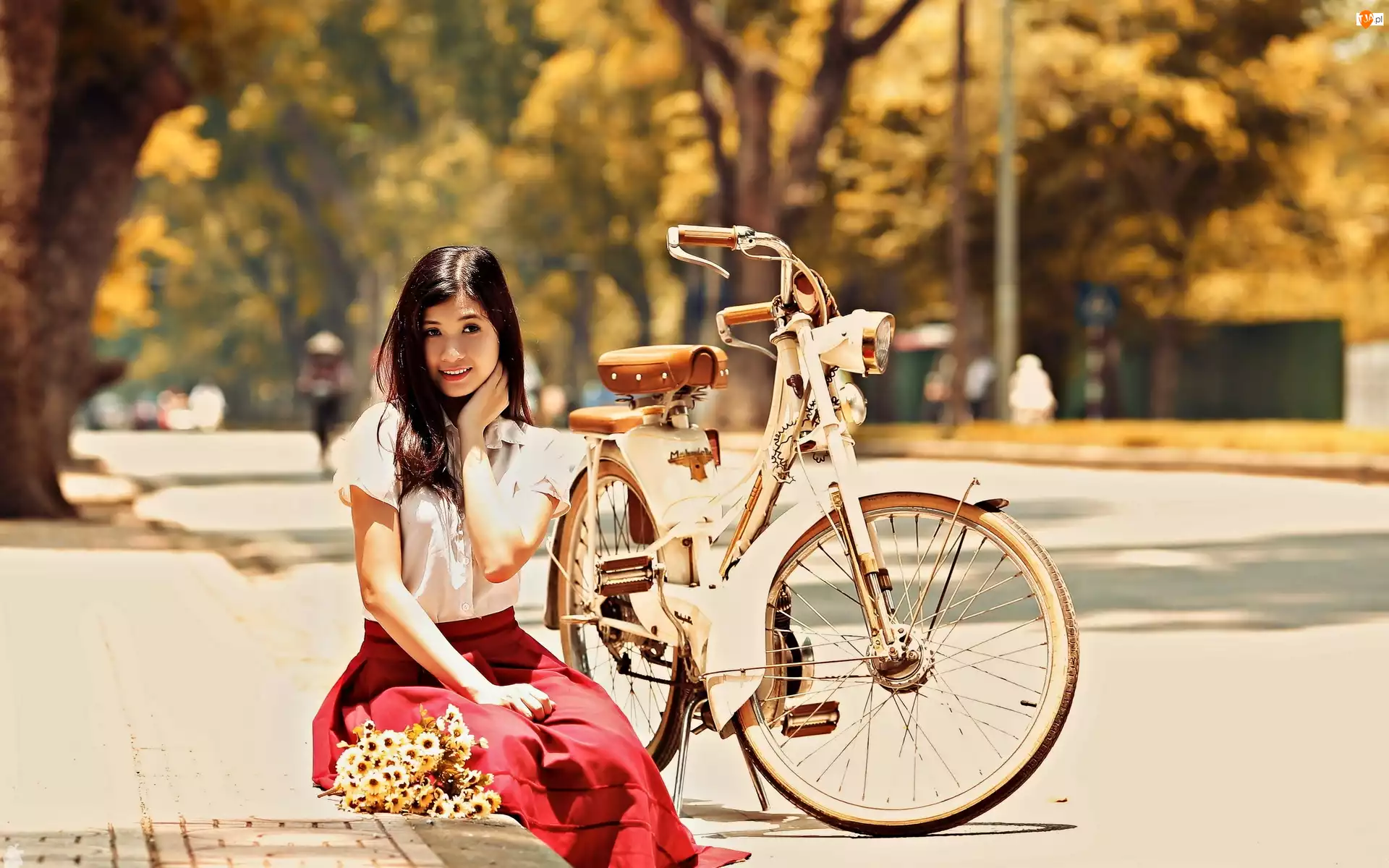 Bukiet, Ulica, Azjatka, Dziewczyna, Rower