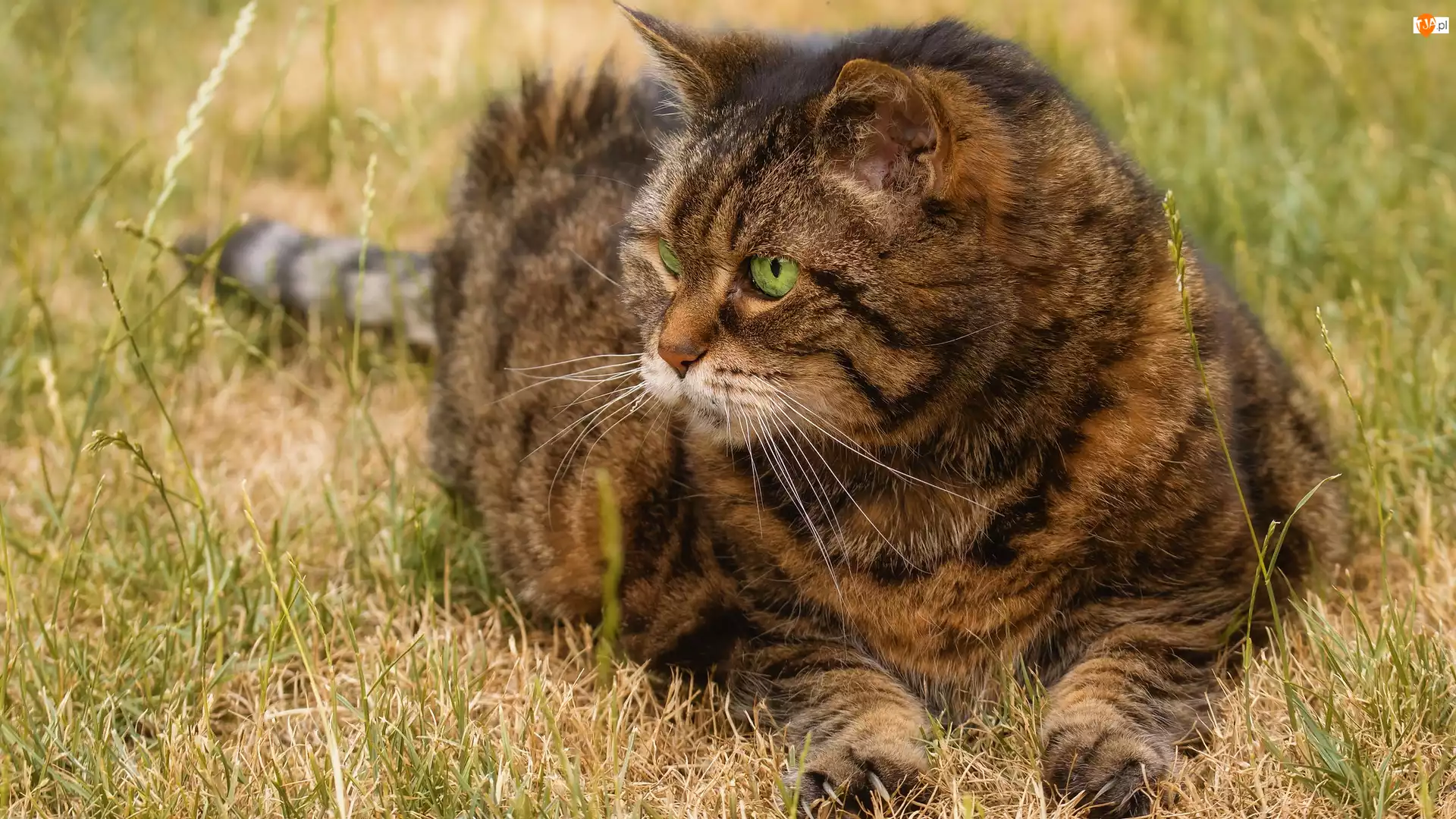 Bury, Trawa, Leżący, Zielonooki, Kot