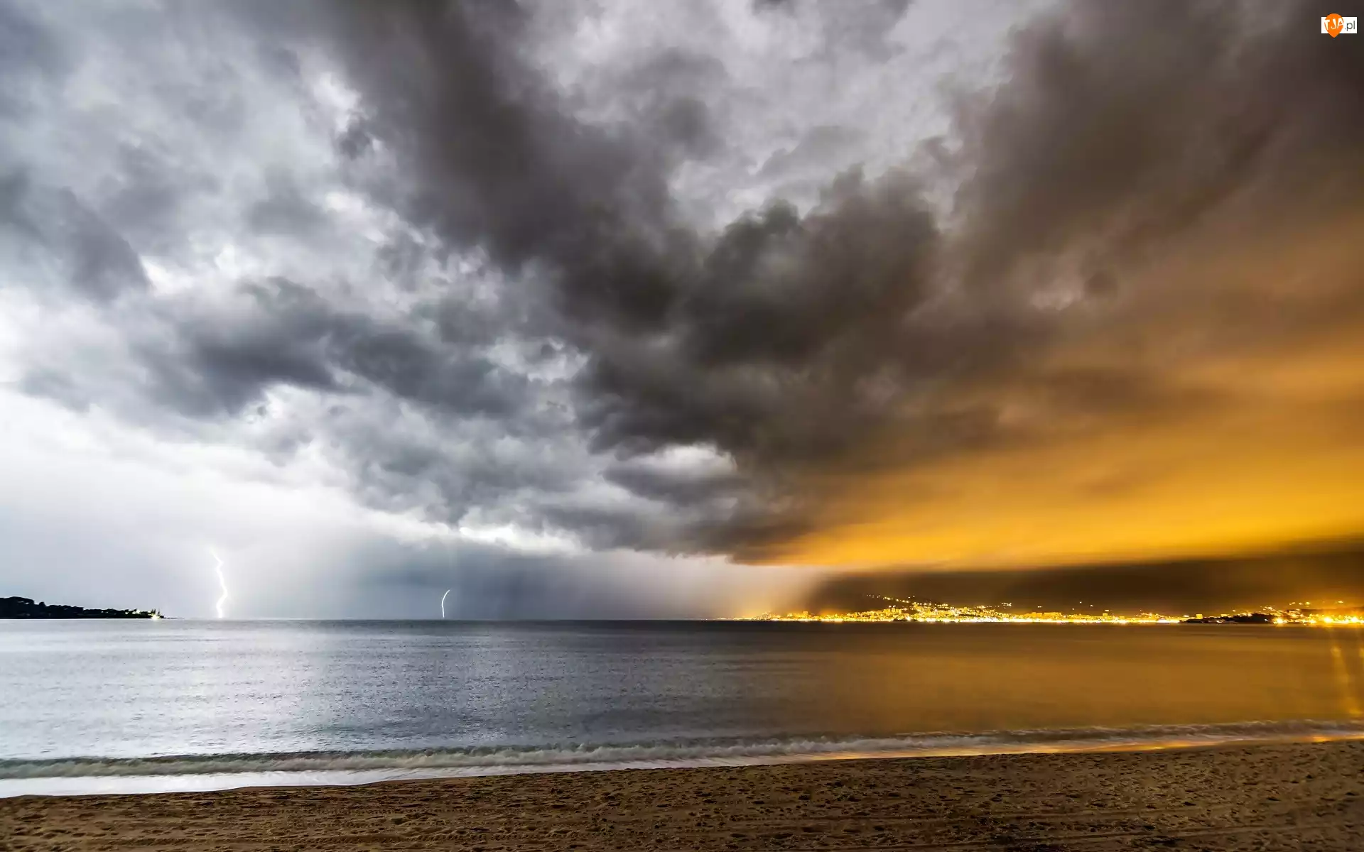 Burza, Zachód Słońca, Pioruny, Morze, Chmury