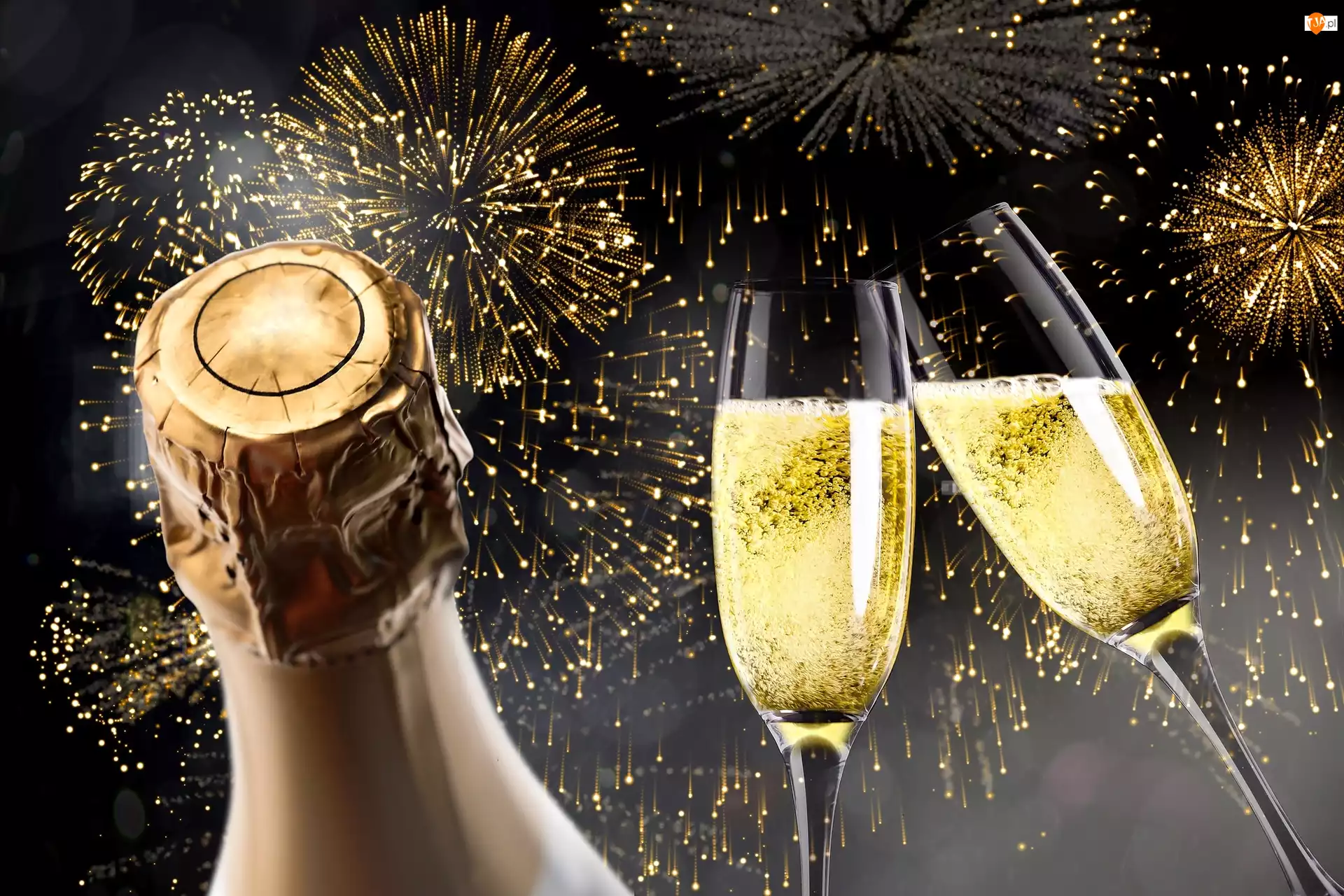 Fajerwerki, Butelka, Szampan, Kieliszki