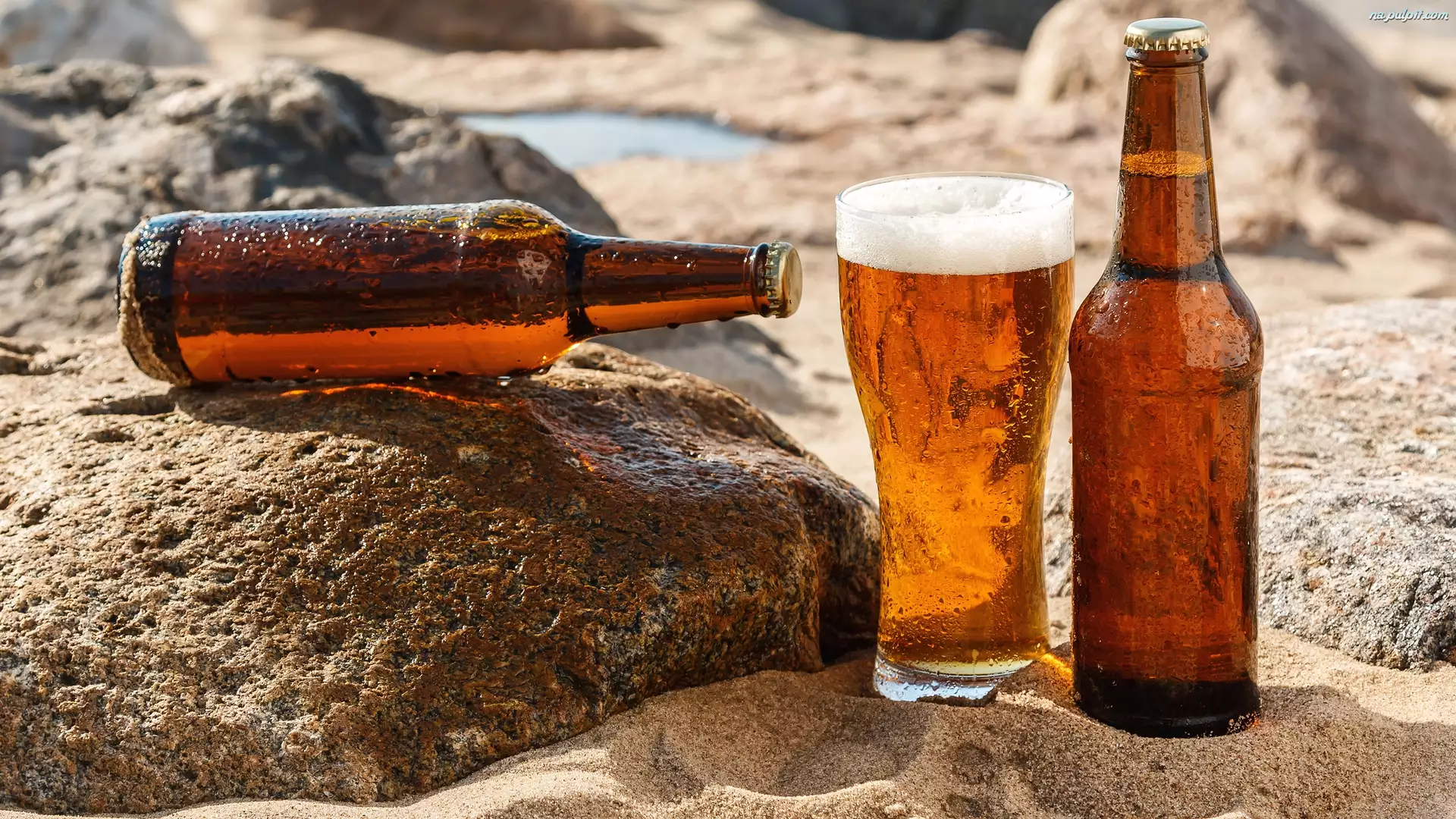 Szklanka, Piasek, Butelki, Piwo, Kamienie